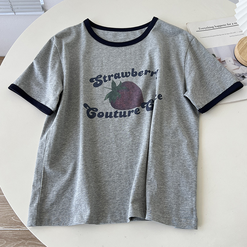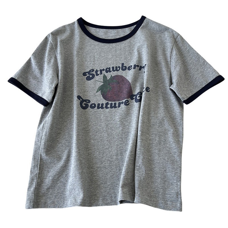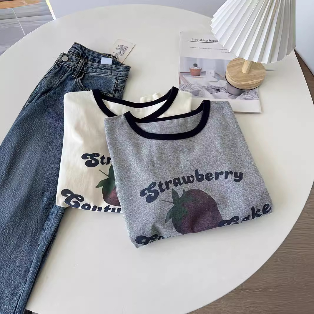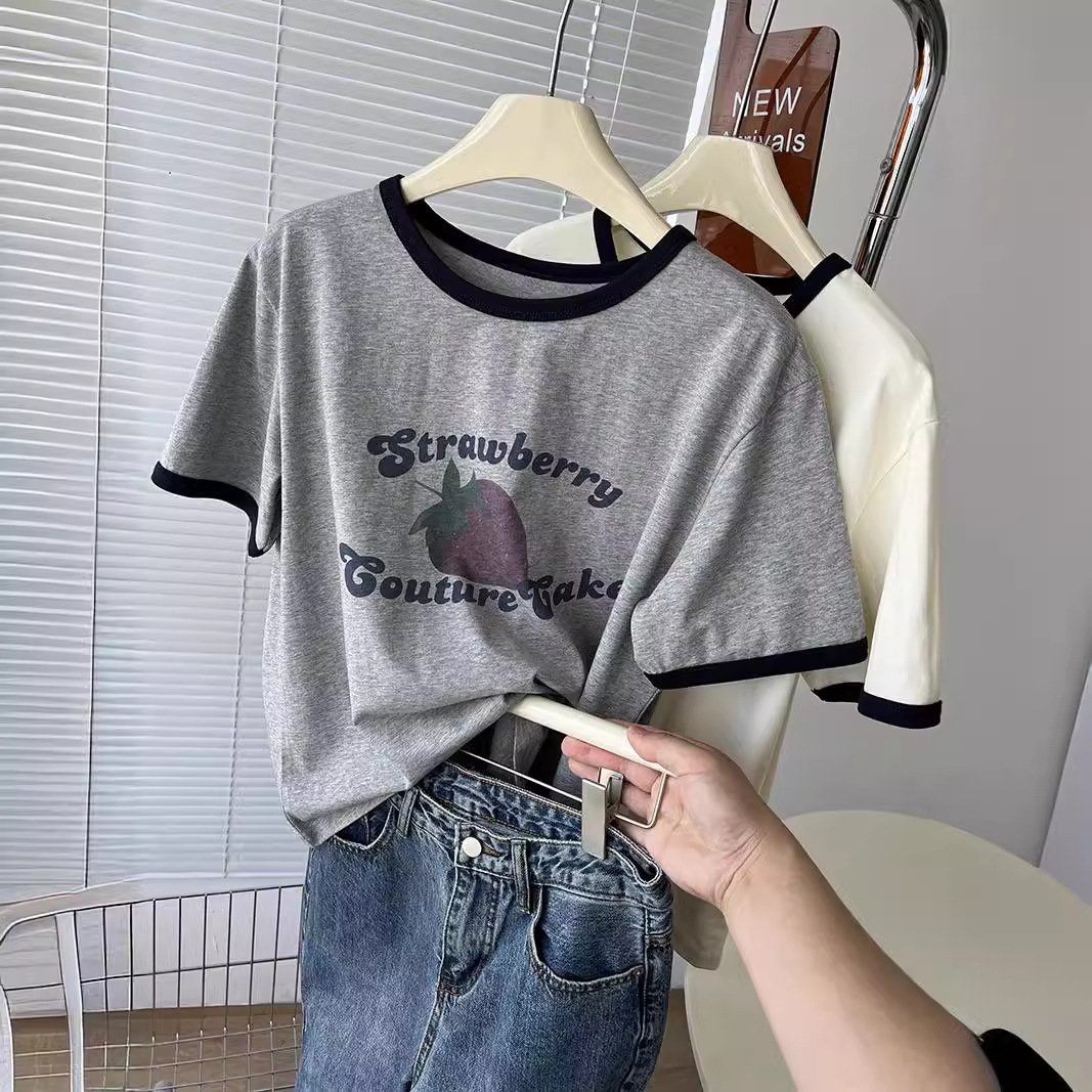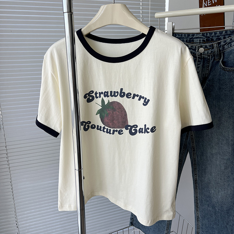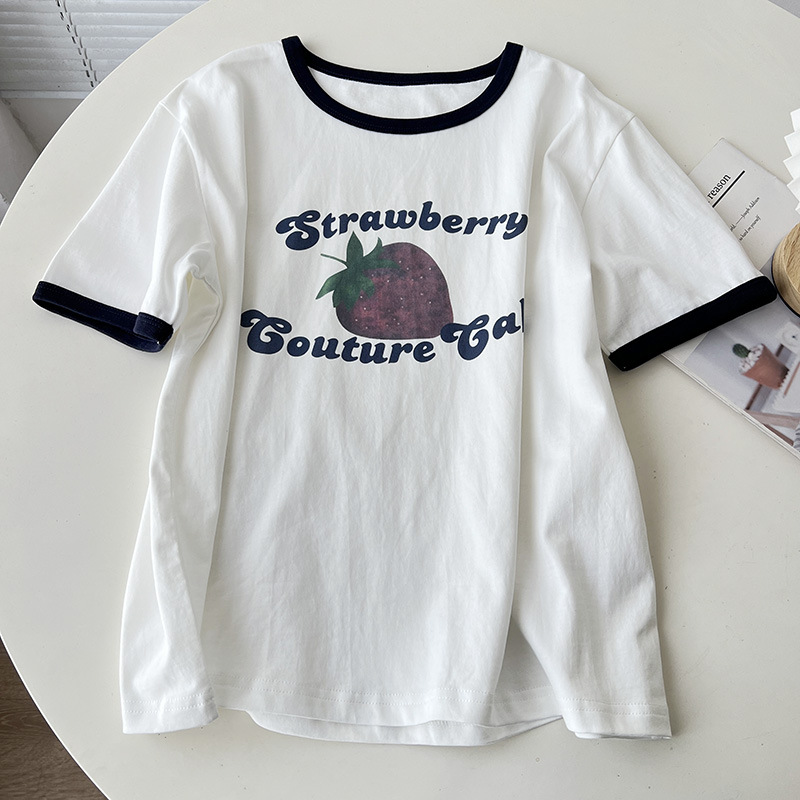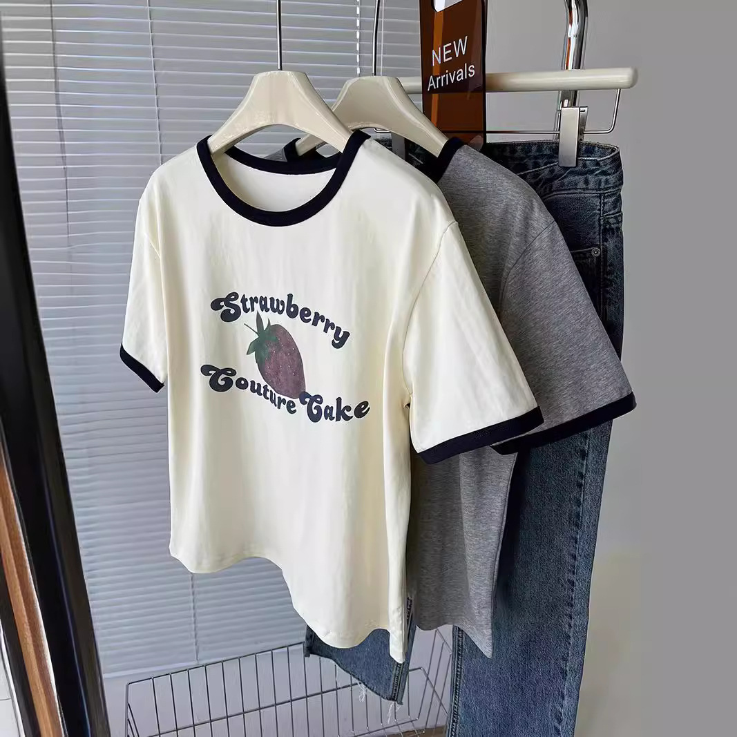 设计感撞色圆领草莓印花短袖T恤女夏季新款减龄宽松显瘦休闲上衣