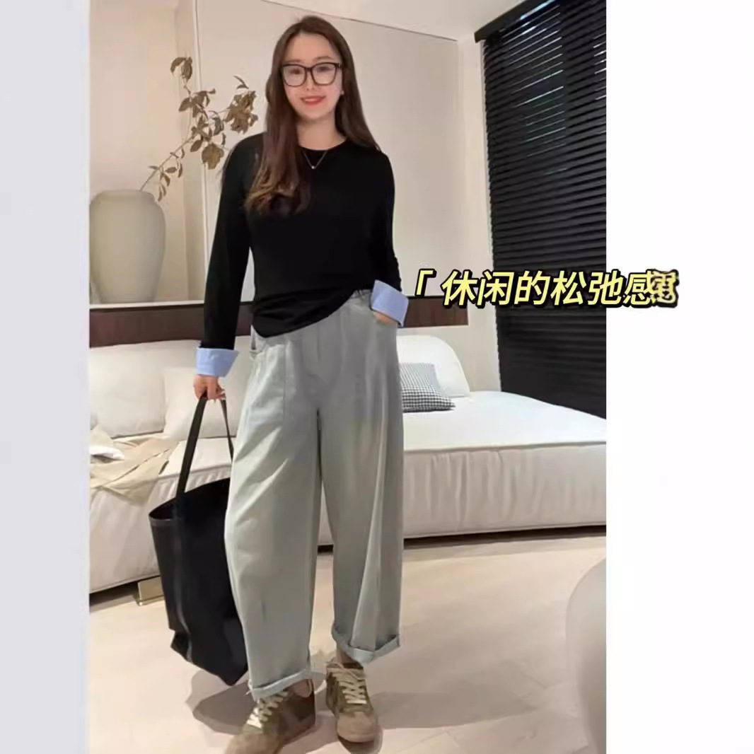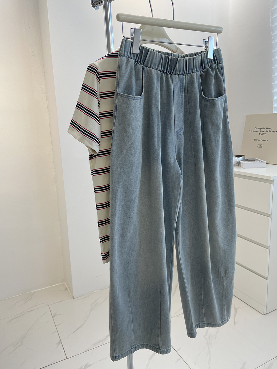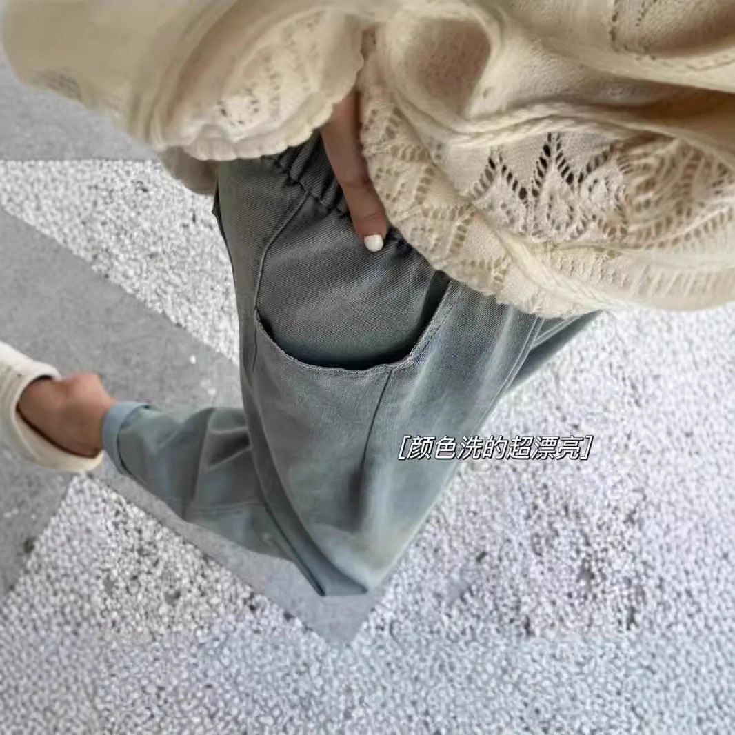 水洗浅蓝阔腿牛仔裤女夏松紧腰显瘦小个子休闲九分奶奶萝卜裤早秋