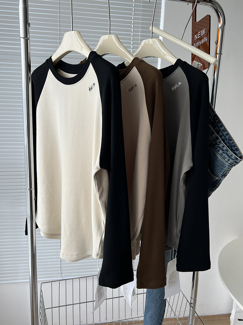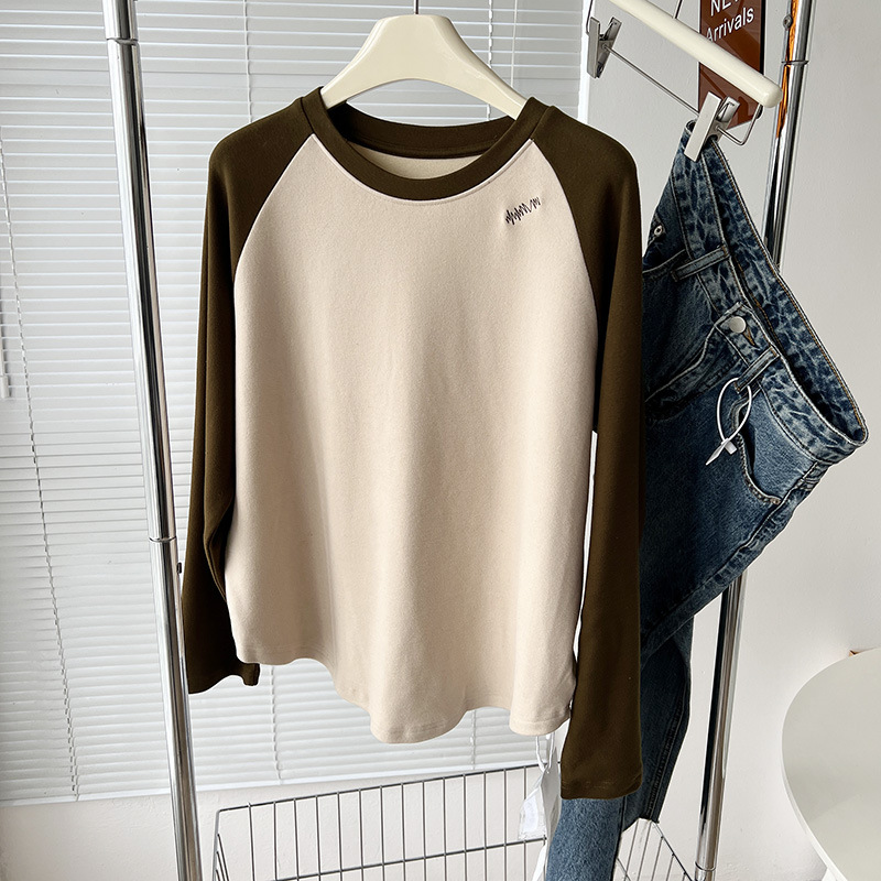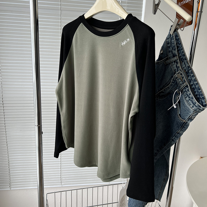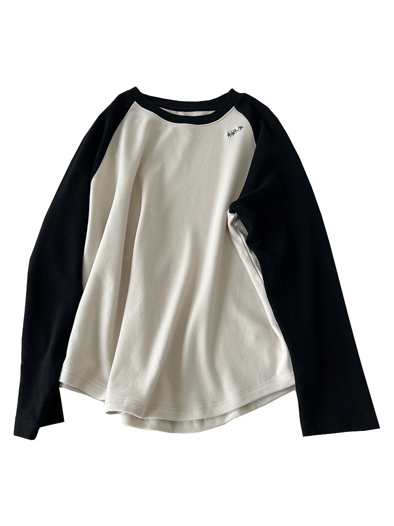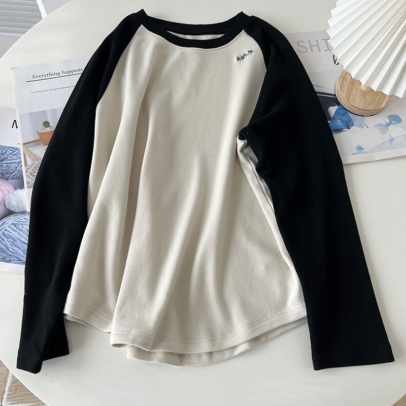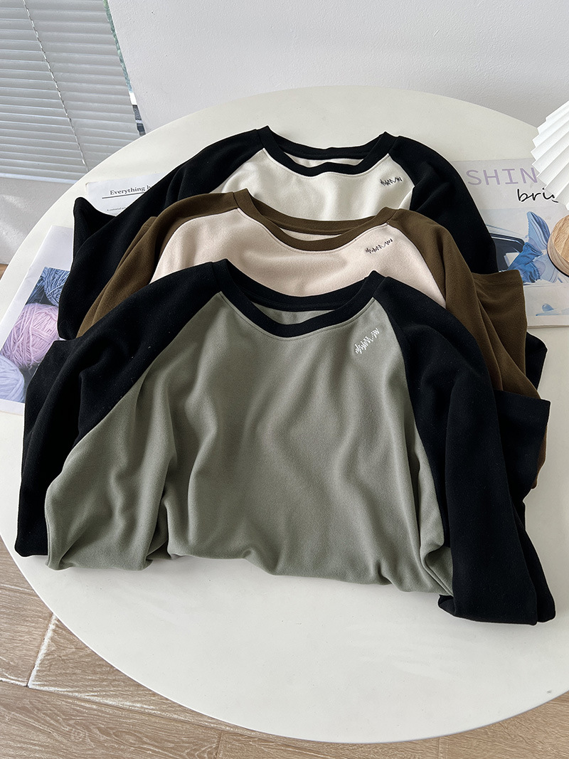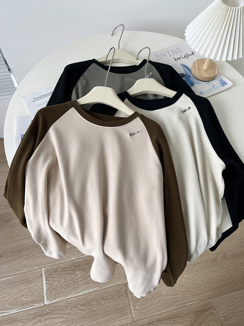 秋冬新款简约刺绣双面德绒撞色插肩袖宽松休闲长袖T恤百搭打底衫