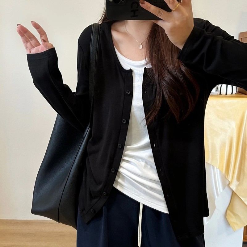 门襟单排扣显瘦长袖开衫假两件秋季百搭圆领黑白假两件T恤女上衣