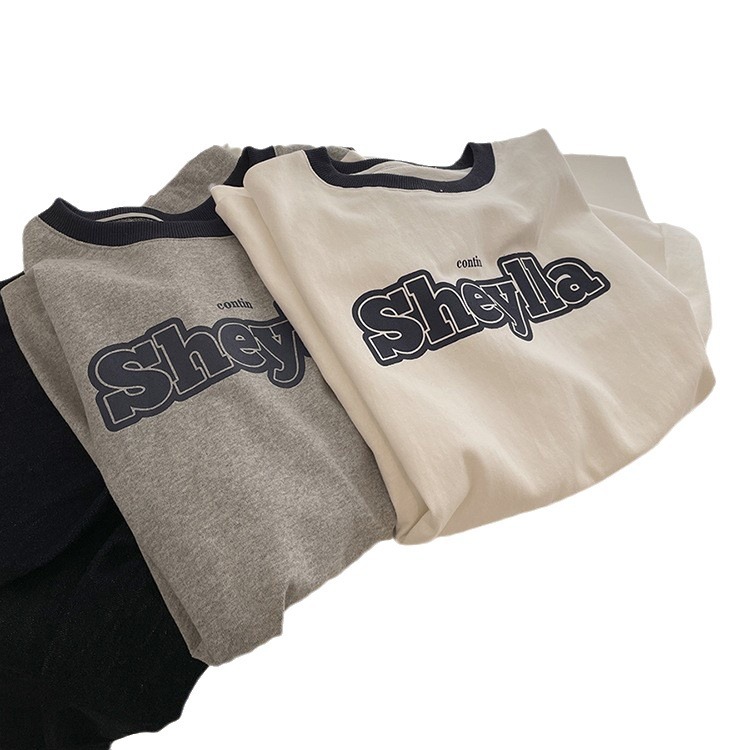 美式字母印花大版T恤!春夏学院风撞色领口宽松中长款休闲短袖女