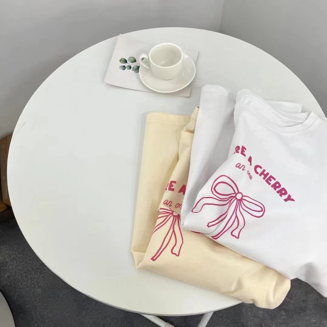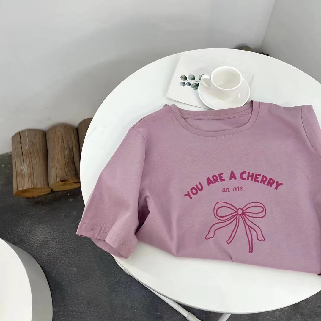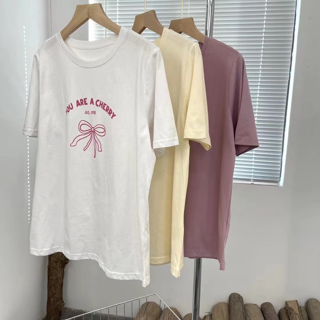 纯棉韩系短袖T恤女蝴蝶结印花夏气质甜美休闲百搭ins风上衣服