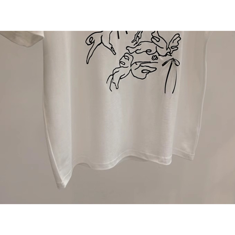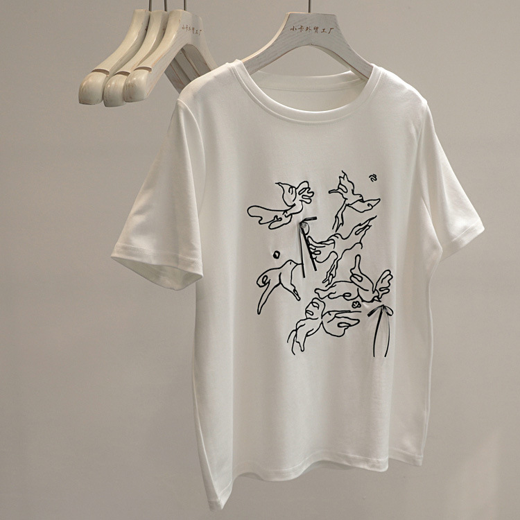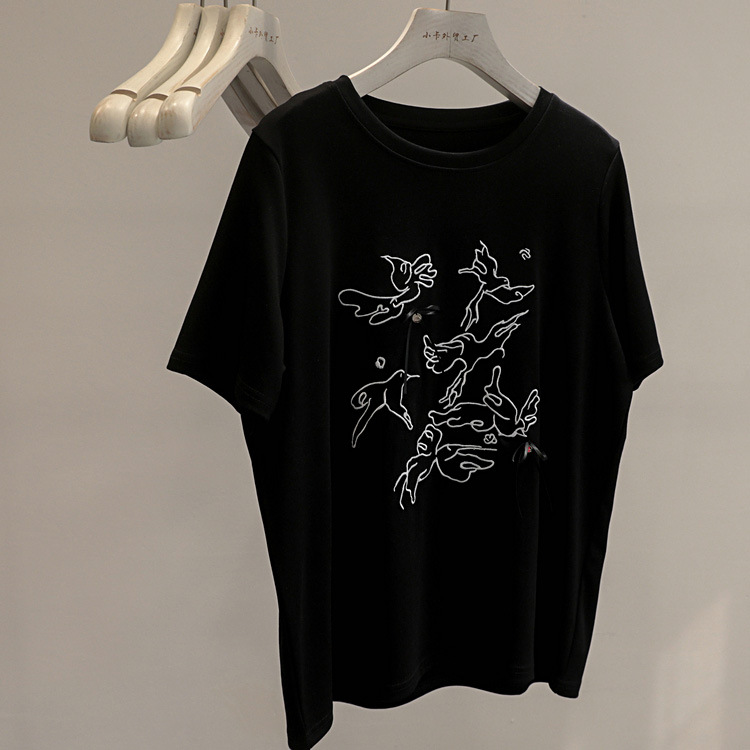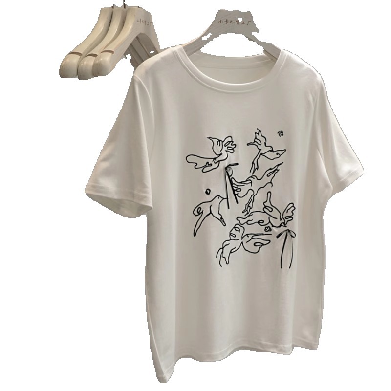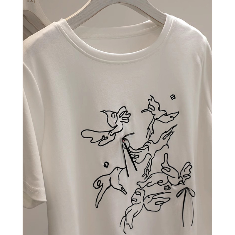 最近超爱~国风刺绣飞鸟蝴蝶结短袖T恤女正肩圆领打底衫上衣潮