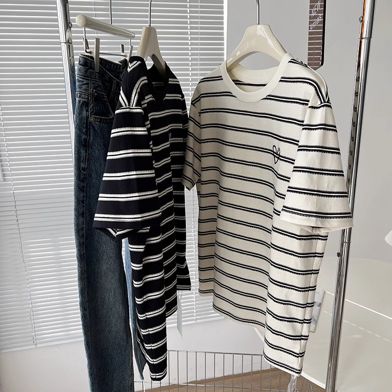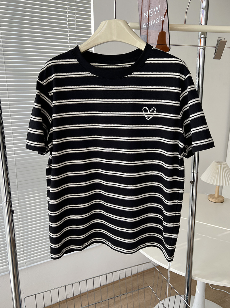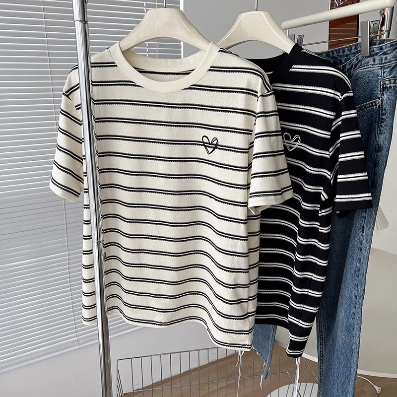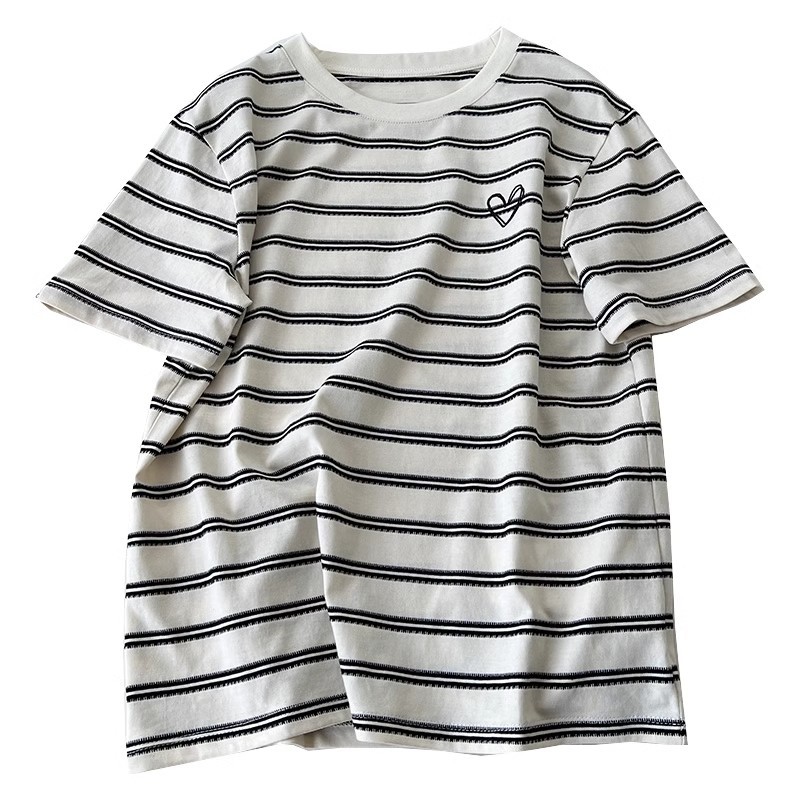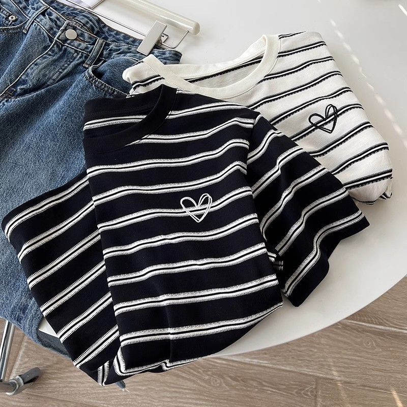 柔软亲肤爱心刺绣条纹显瘦短袖T恤女夏季圆领百搭宽松遮肉上衣夏