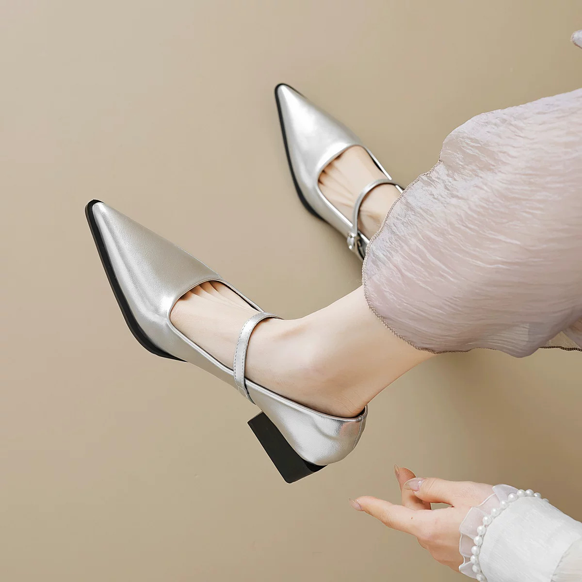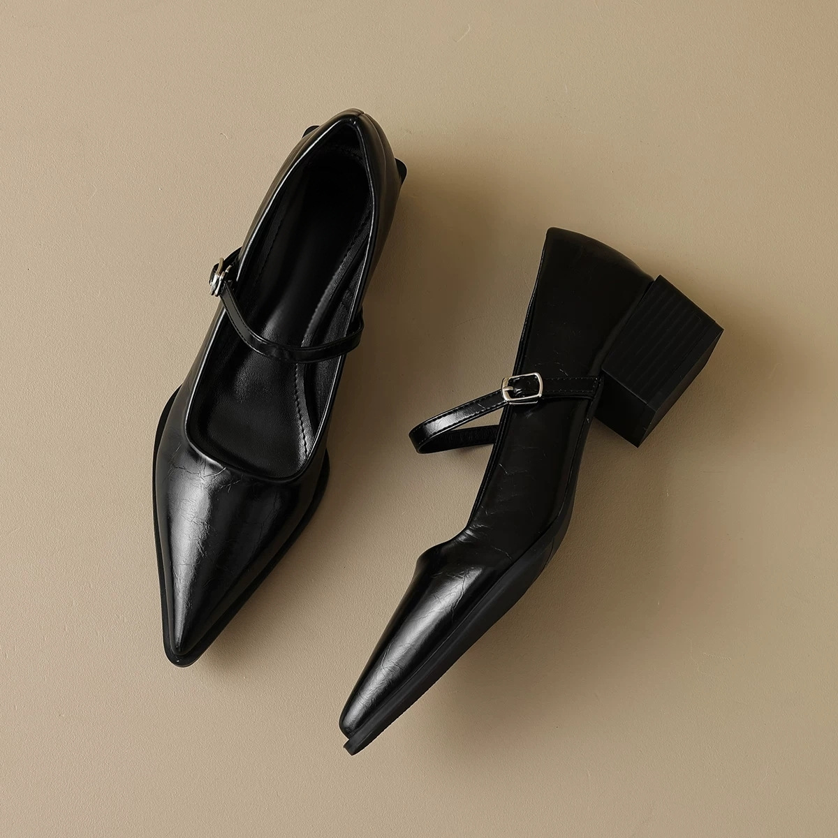 时尚百搭法式尖头玛丽珍鞋女新款粗跟单鞋黑色小皮鞋女