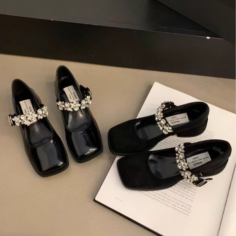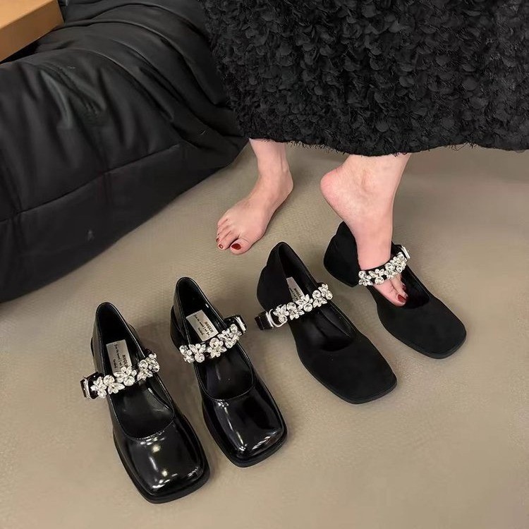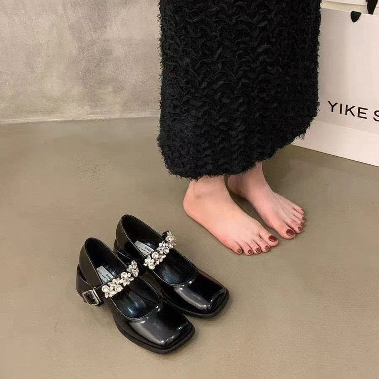 黑色方头单鞋女2025春季新款一字扣带气质高跟鞋粗跟玛丽珍小皮鞋