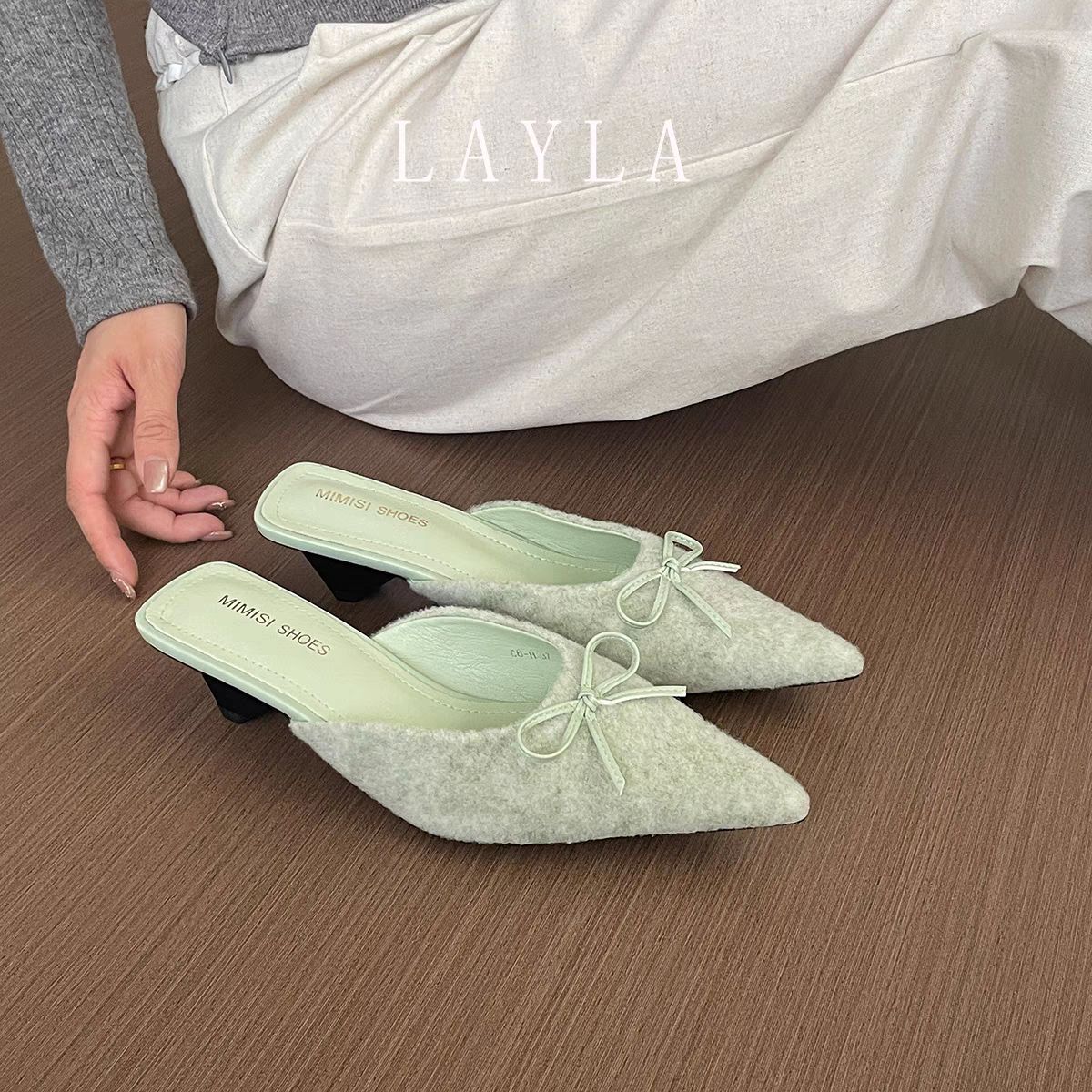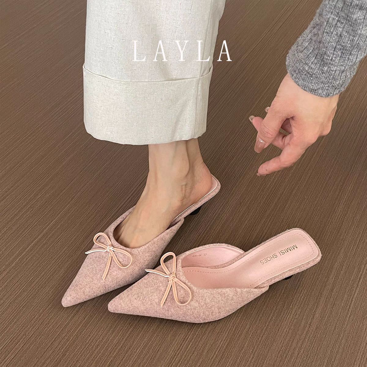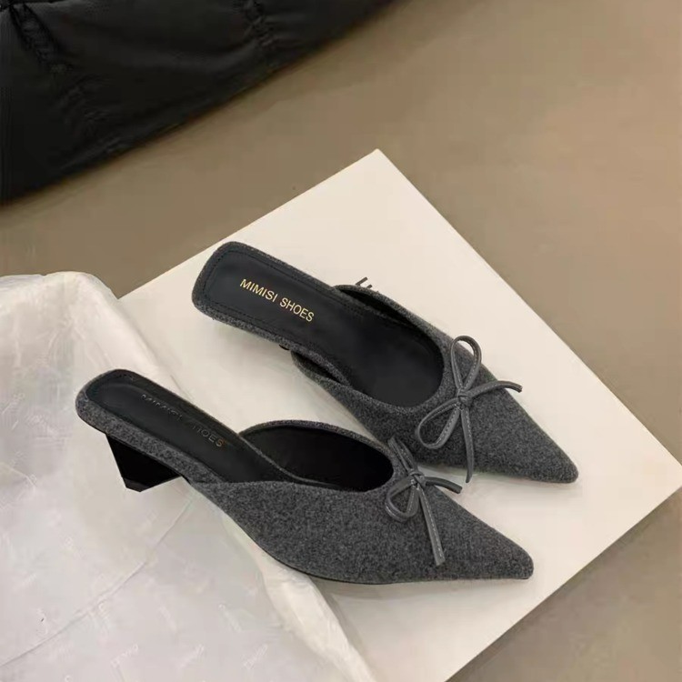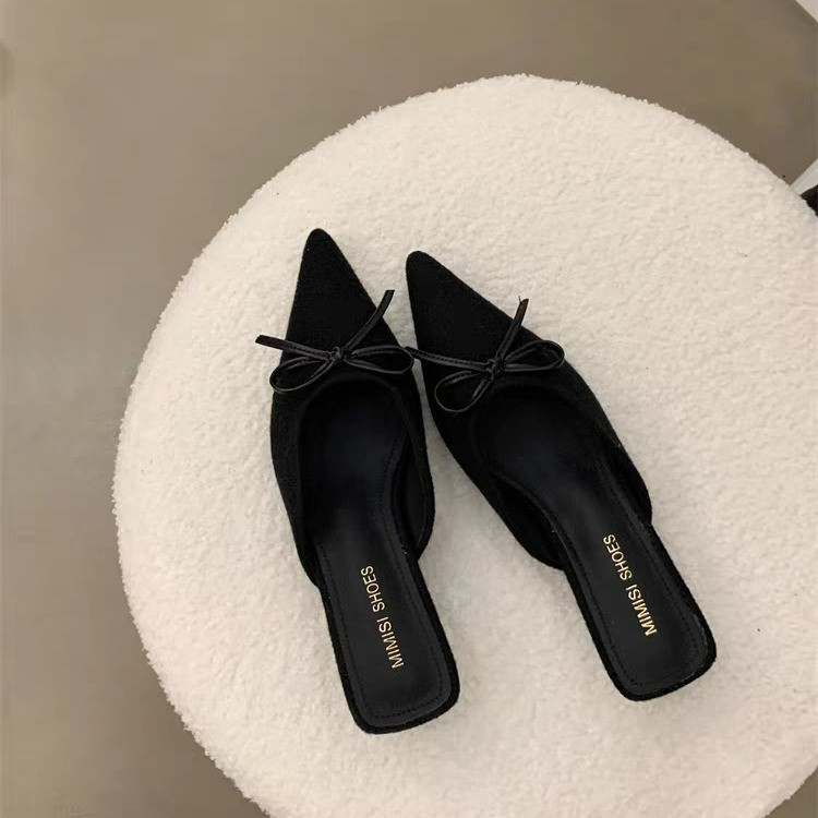 2025年韩版尖头蝴蝶结绒面包头半拖鞋女外穿2025年春秋新款锥形跟