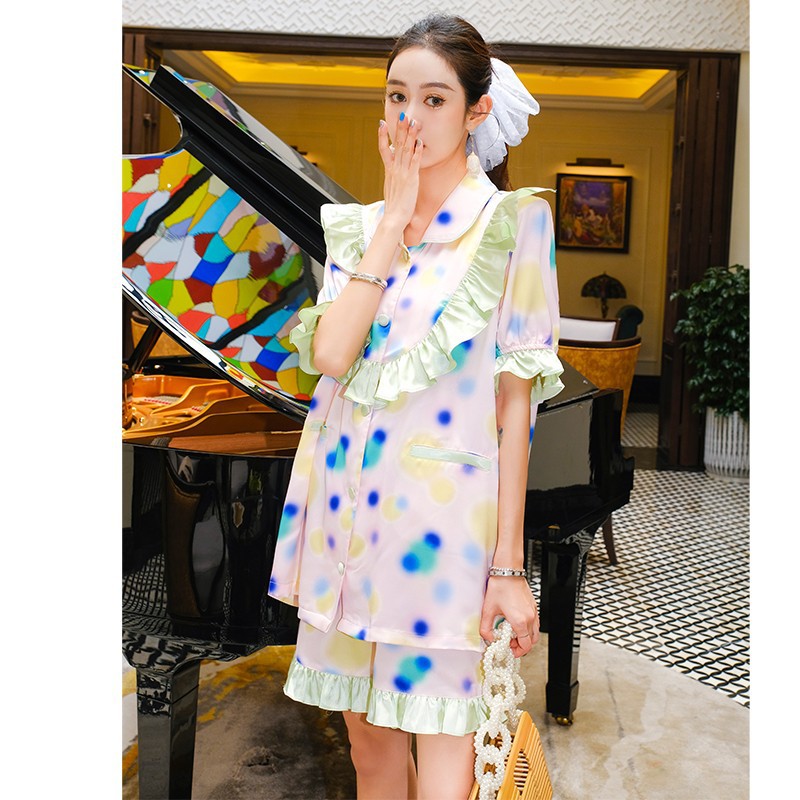 晕染波点大荷叶边仿真丝冰丝睡衣短袖短裤两件套装薄款透气家居服