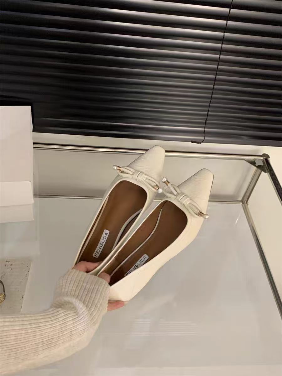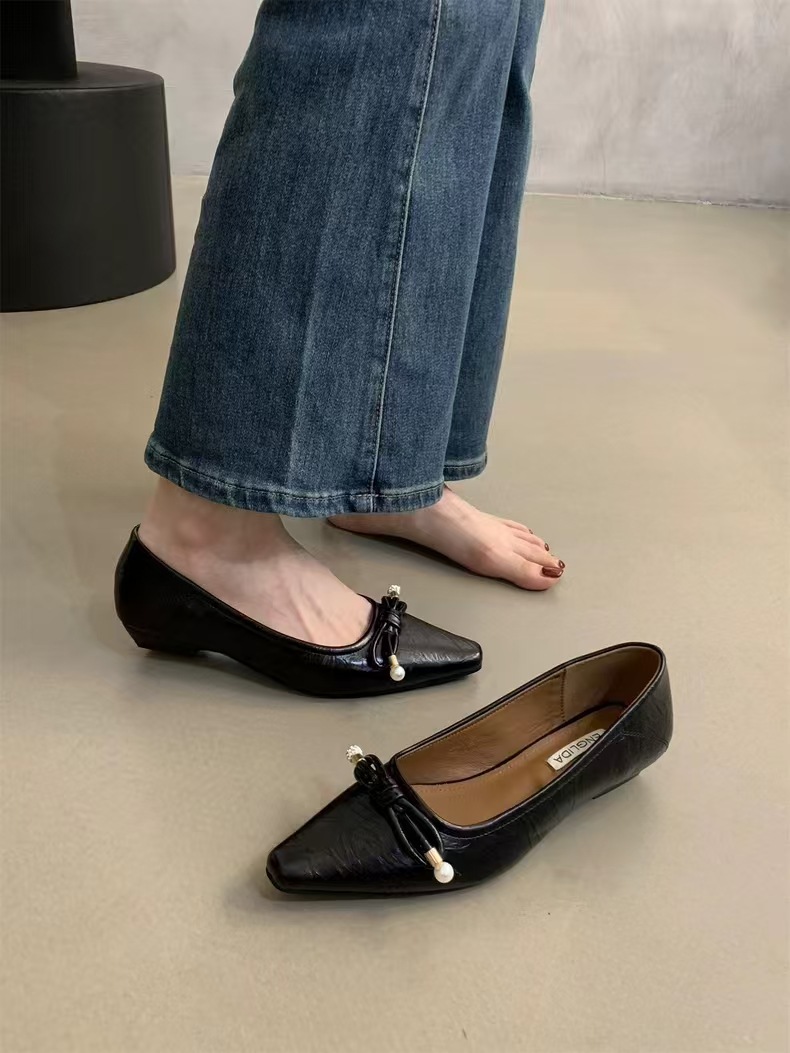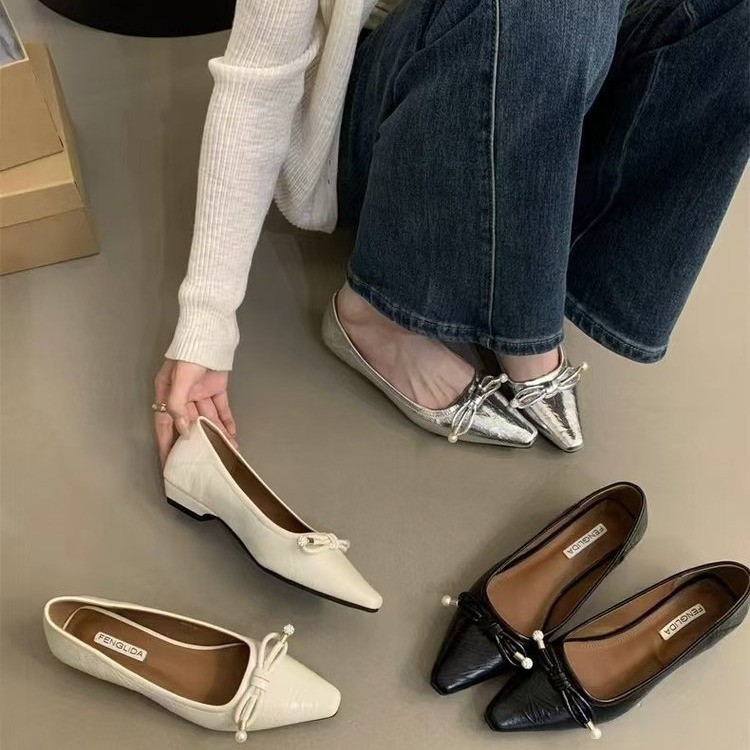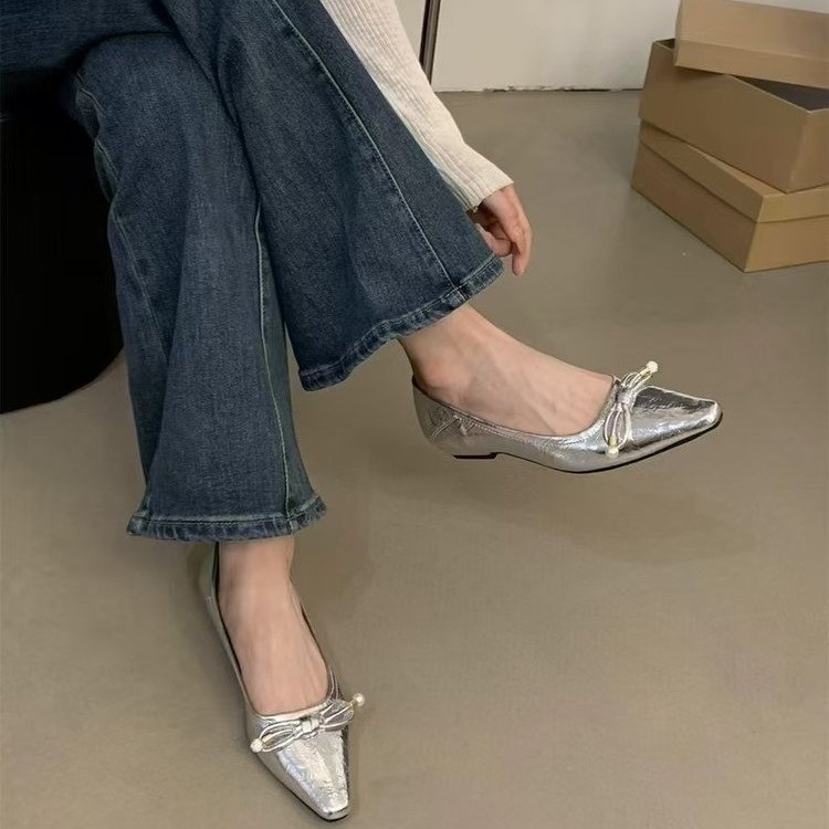 尖头银色单鞋女春秋韩版蝴蝶结晚晚仙女通勤低跟一脚蹬工作奶奶鞋