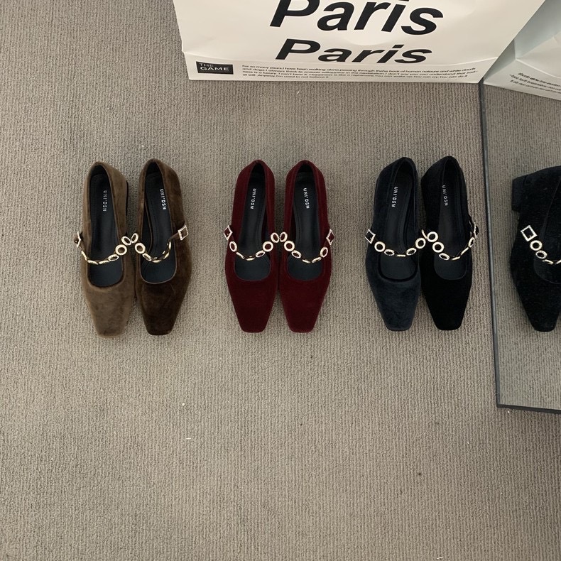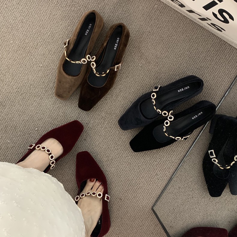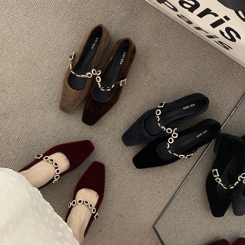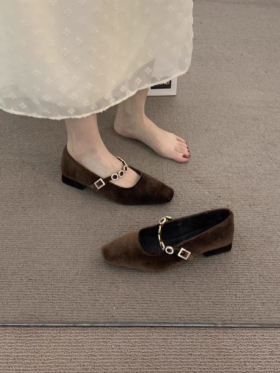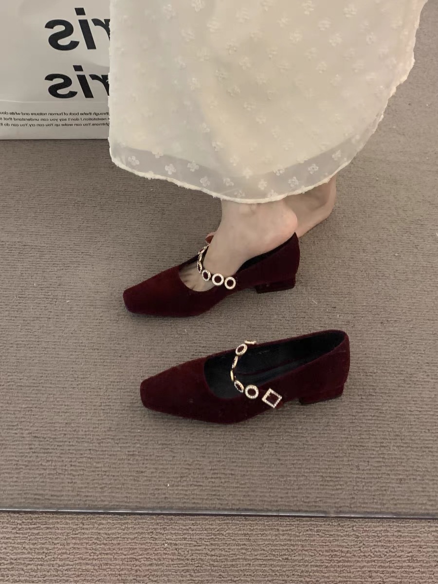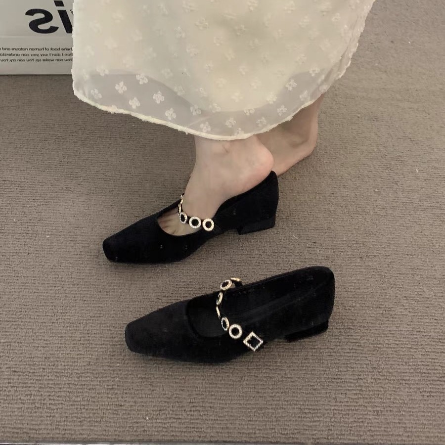 方头单鞋女新款丝绒面低跟平底浅口粗跟气质法式玛丽珍鞋