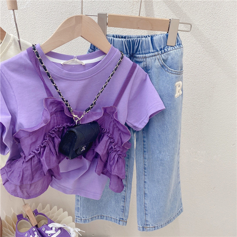 女童2025新韩版洋气两件套短袖T恤宝宝夏装儿童紫色花边上衣童装