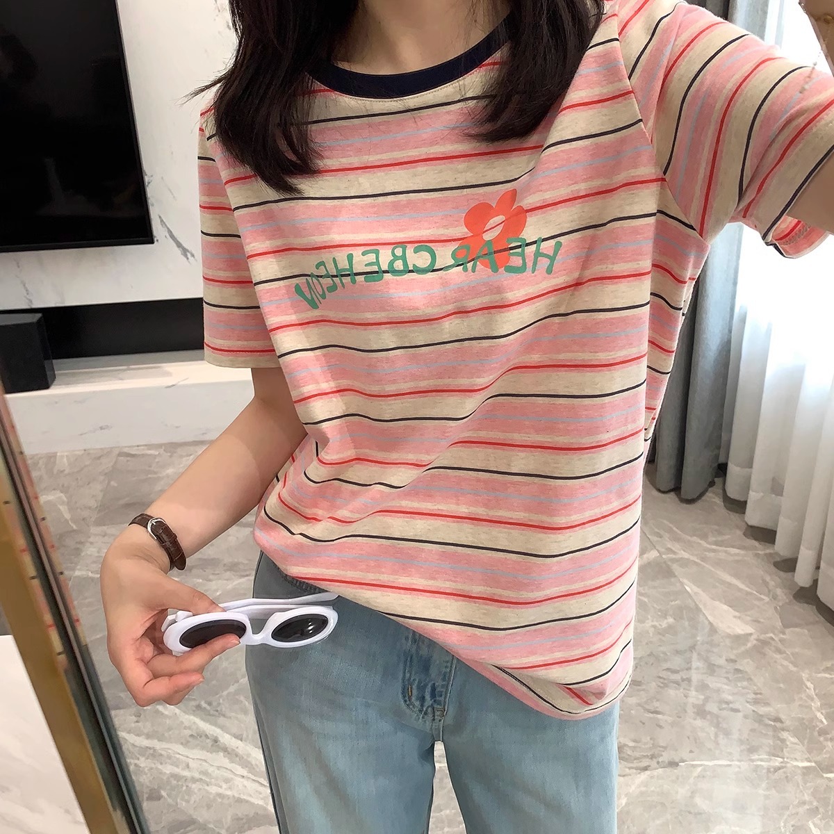 花朵印花条纹粉色T恤撞色领夏季彩棉宽松百搭多巴胺短袖