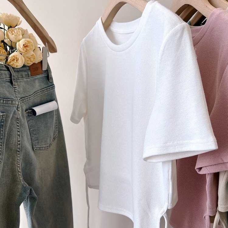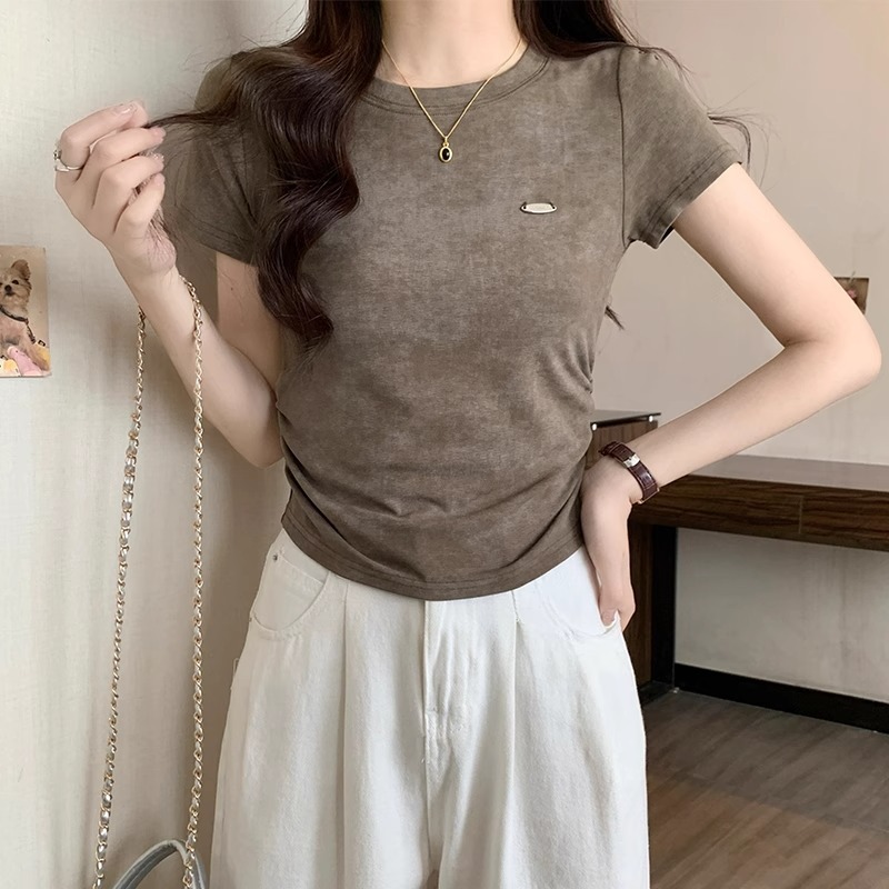 美式圆领正肩短袖t恤女春夏新款设计感抽褶收腰纯欲修身小衫上衣