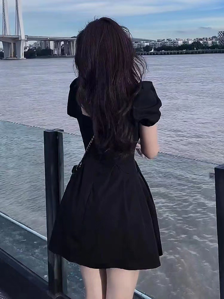 高级感赫本风小黑裙女夏季新款法式复古方领泡泡袖收腰连衣裙甜辣