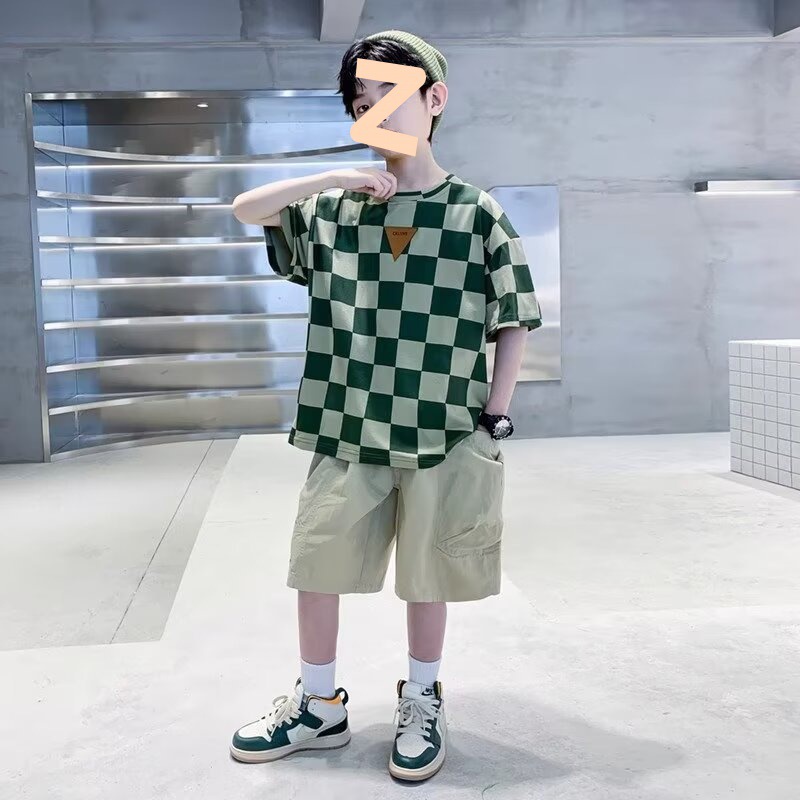 跨境男童夏季短袖新款大儿童洋气运动休闲格子满印短袖T恤潮