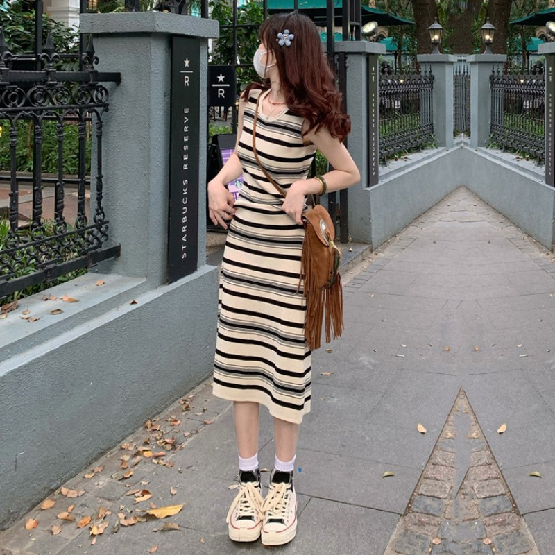 修身条纹针织背心连衣裙女夏季收腰显瘦中长款包臀裙无袖t恤裙子