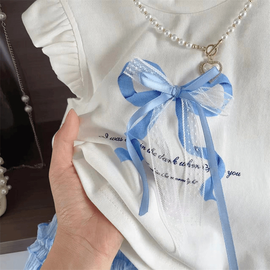 新品女童夏季套装2025新时髦蝴蝶结飞袖T恤蛋糕裙中小童两件套