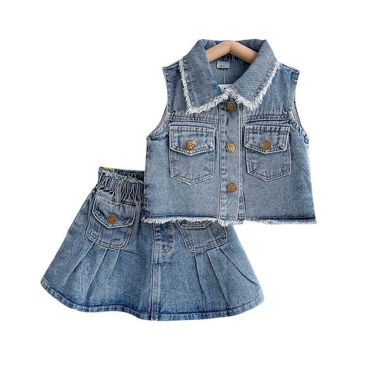 女童夏季新款牛仔套装女孩无袖毛边外套百褶裙时髦两件套