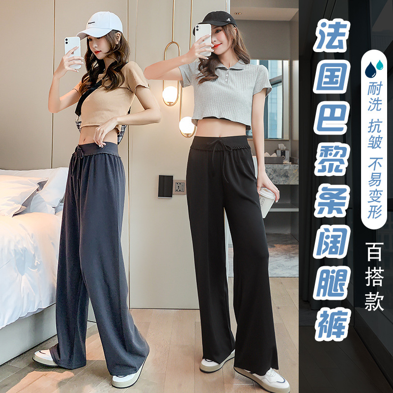 巴黎条阔腿裤垂坠感长裤小个子宽松显瘦拖地瘦瘦裤高腰花边休闲裤
