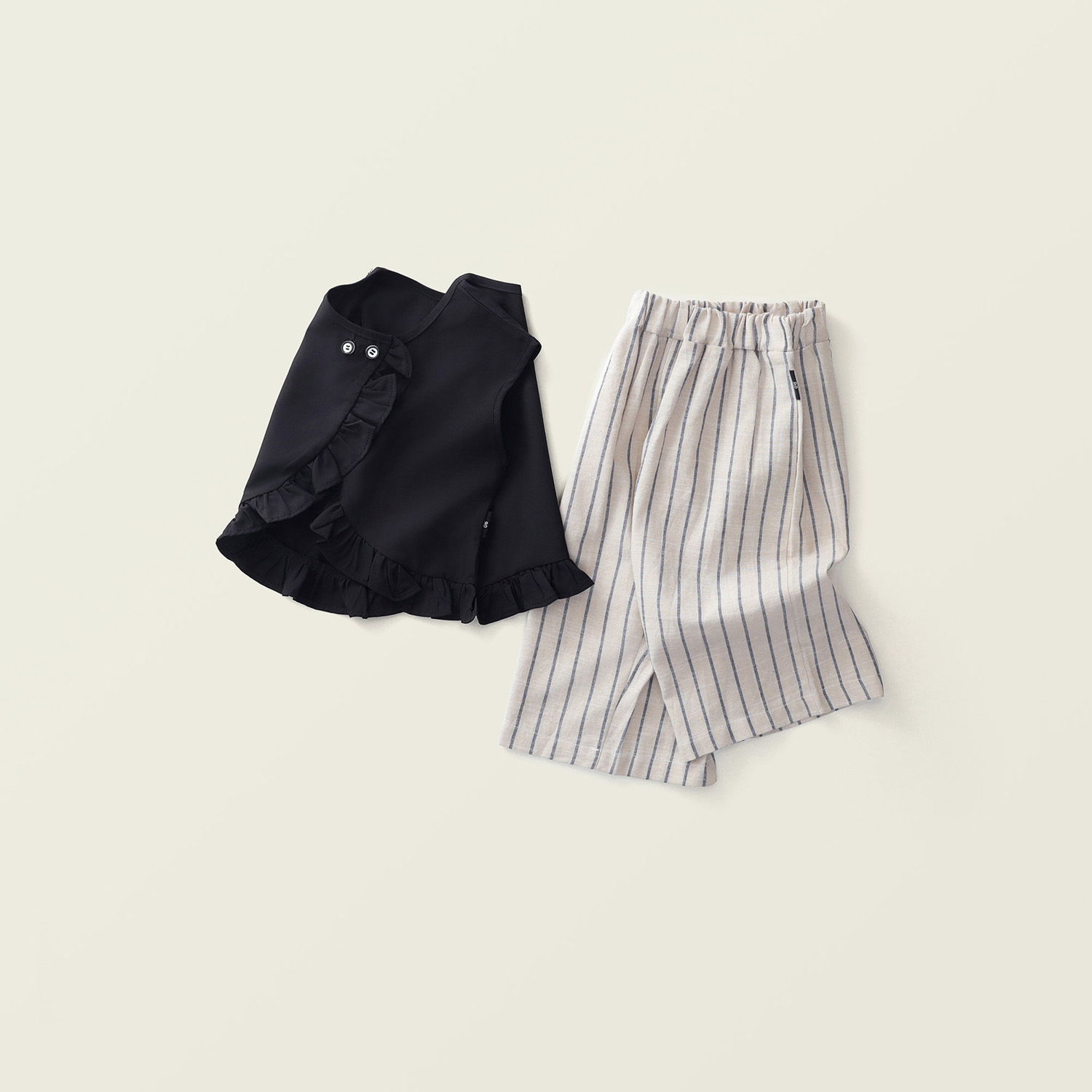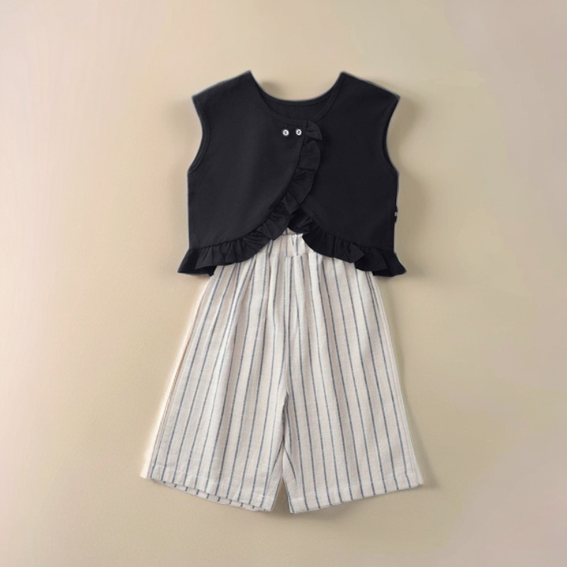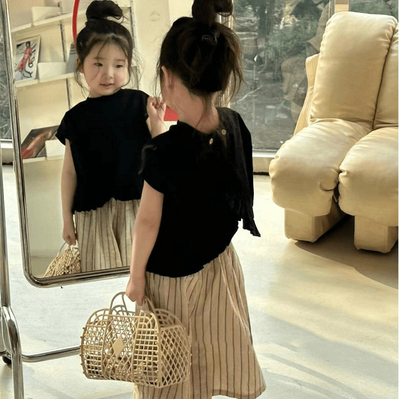 2025韩国夏装新款复古女童森系不规则落肩袖两面穿条纹阔腿裤套装