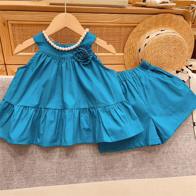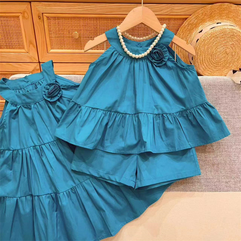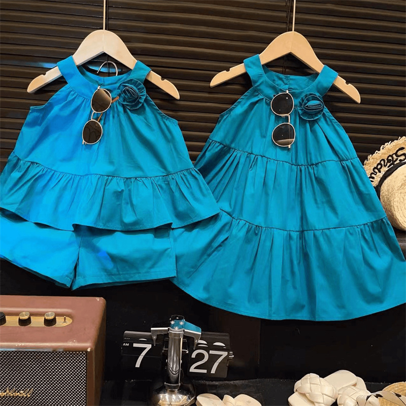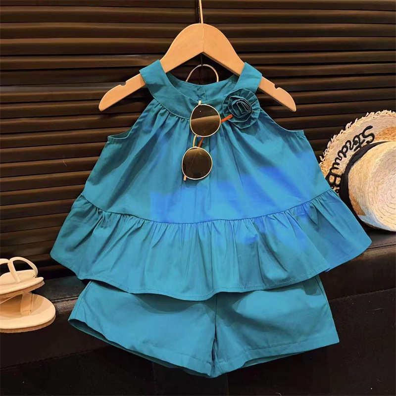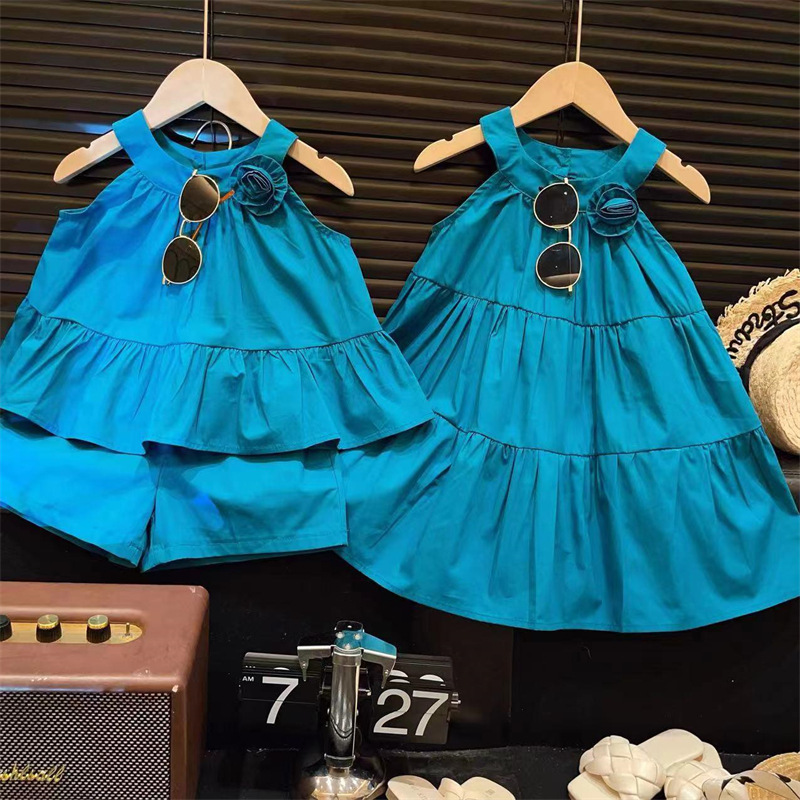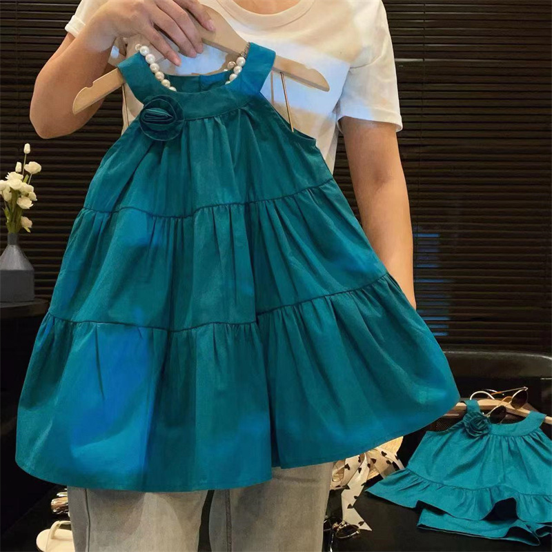 蓝色立体花朵吊带套装