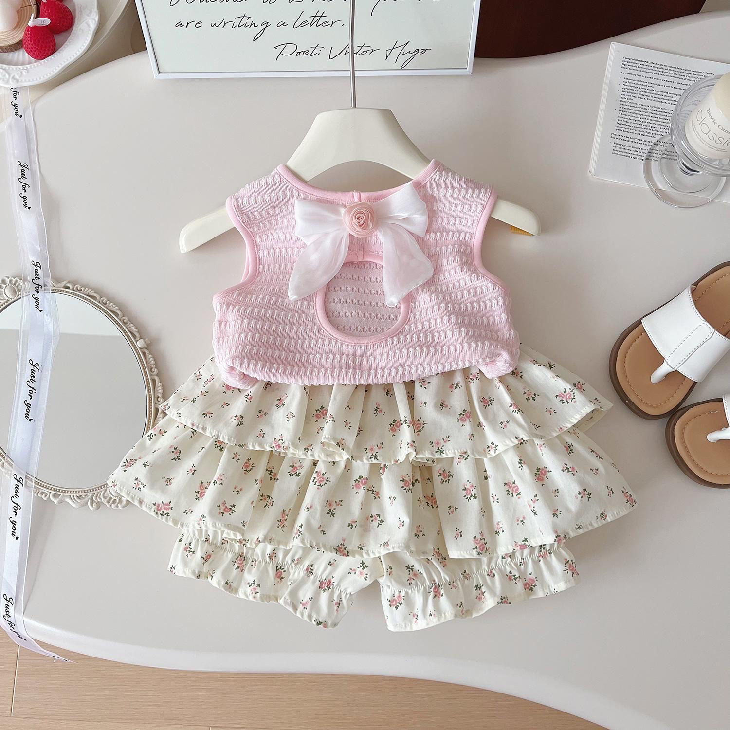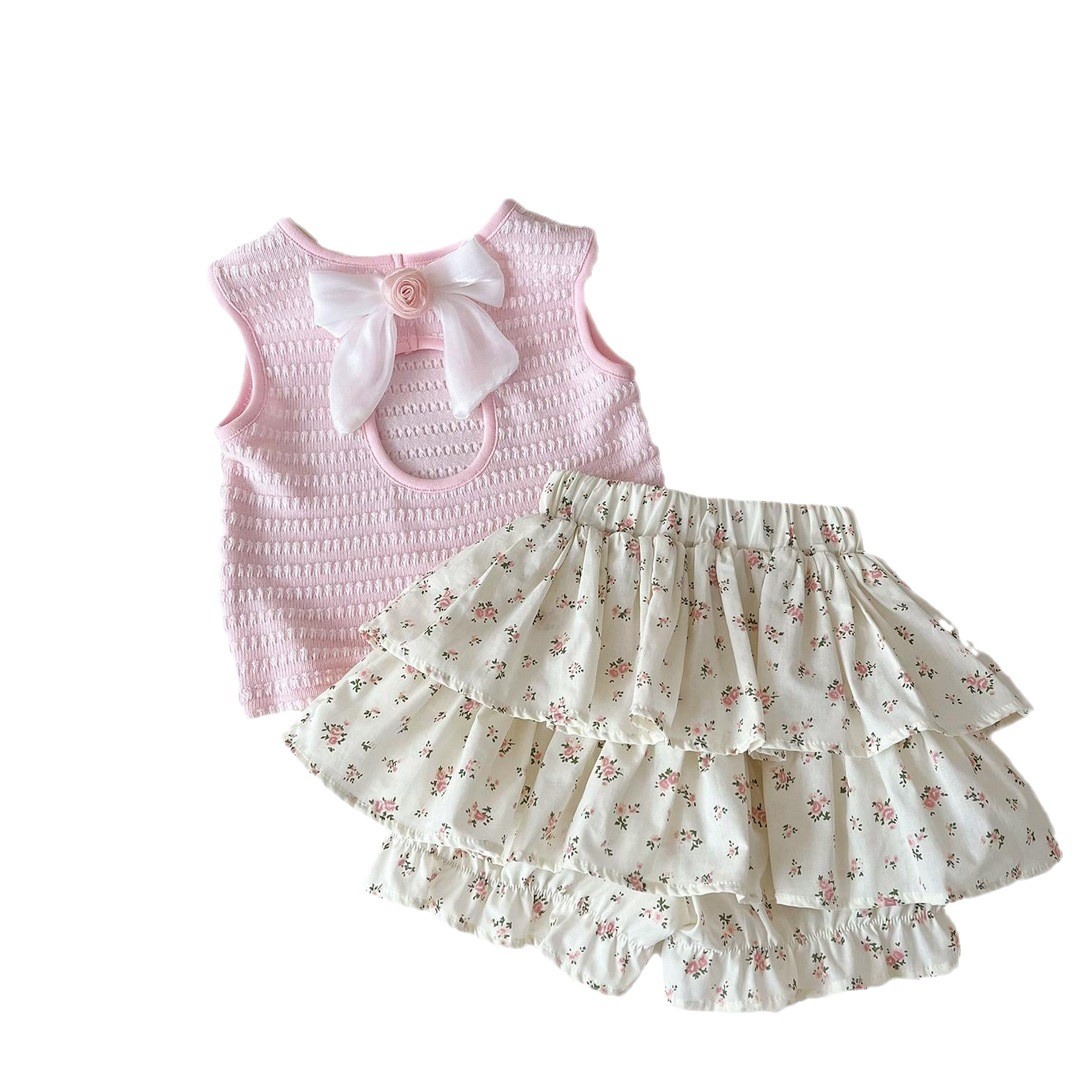女童夏季套装2025新款女宝洋气蝴蝶结背心时尚碎花裙裤休闲两件套