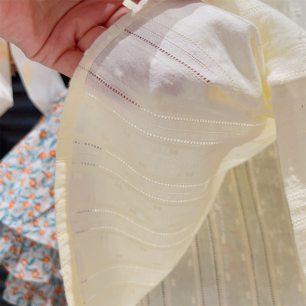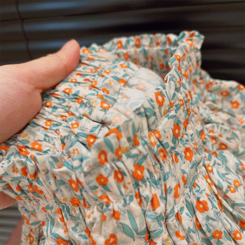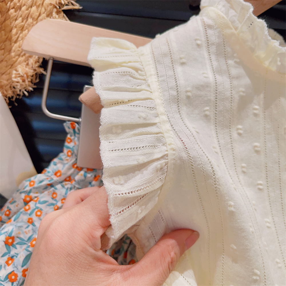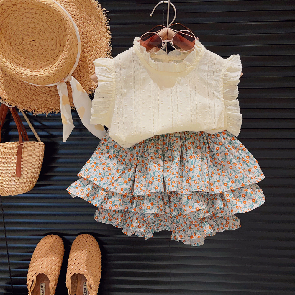 新品童装女童花边飞袖洋气打底衫碎花蛋糕裙裤两件套2025夏装