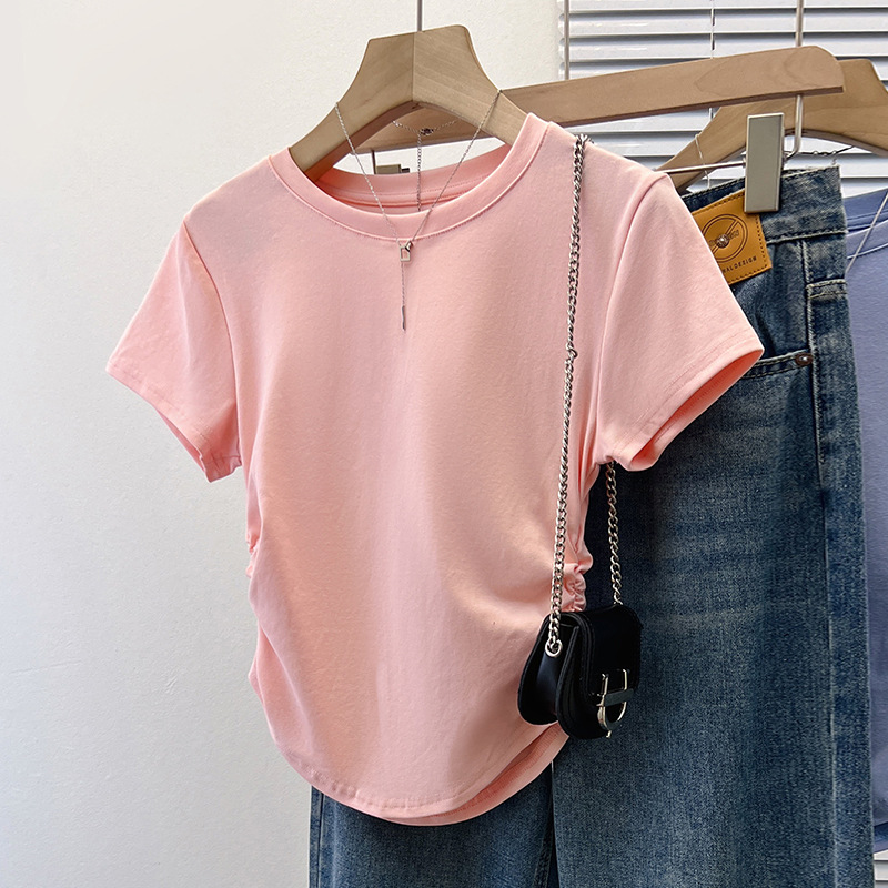 实拍正肩短袖T恤女夏季韩版收腰褶皱短款半袖体恤美式辣妹上衣
