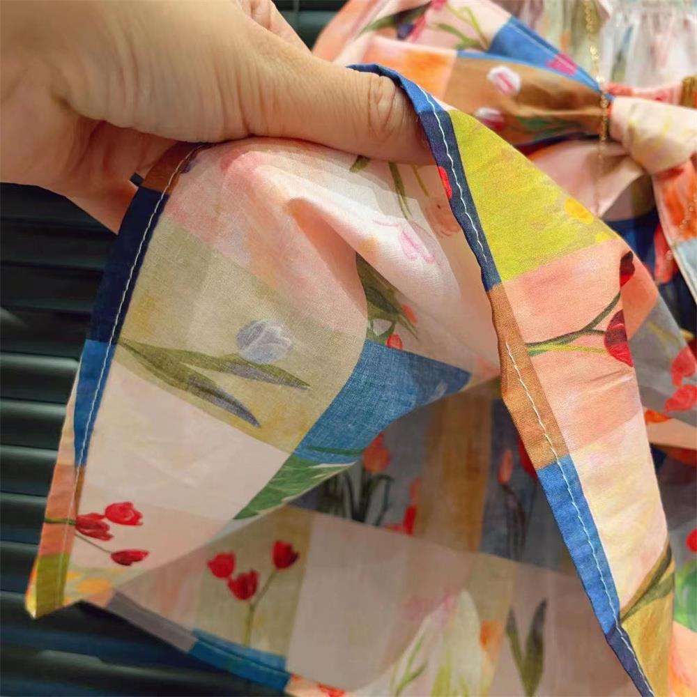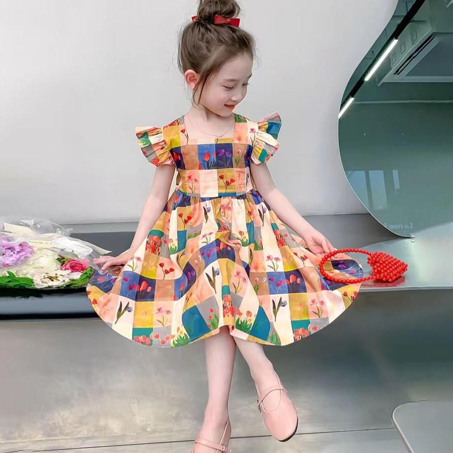 新品女童彩色格子花朵飞袖露背蝴蝶结公主背心裙2025夏装套装