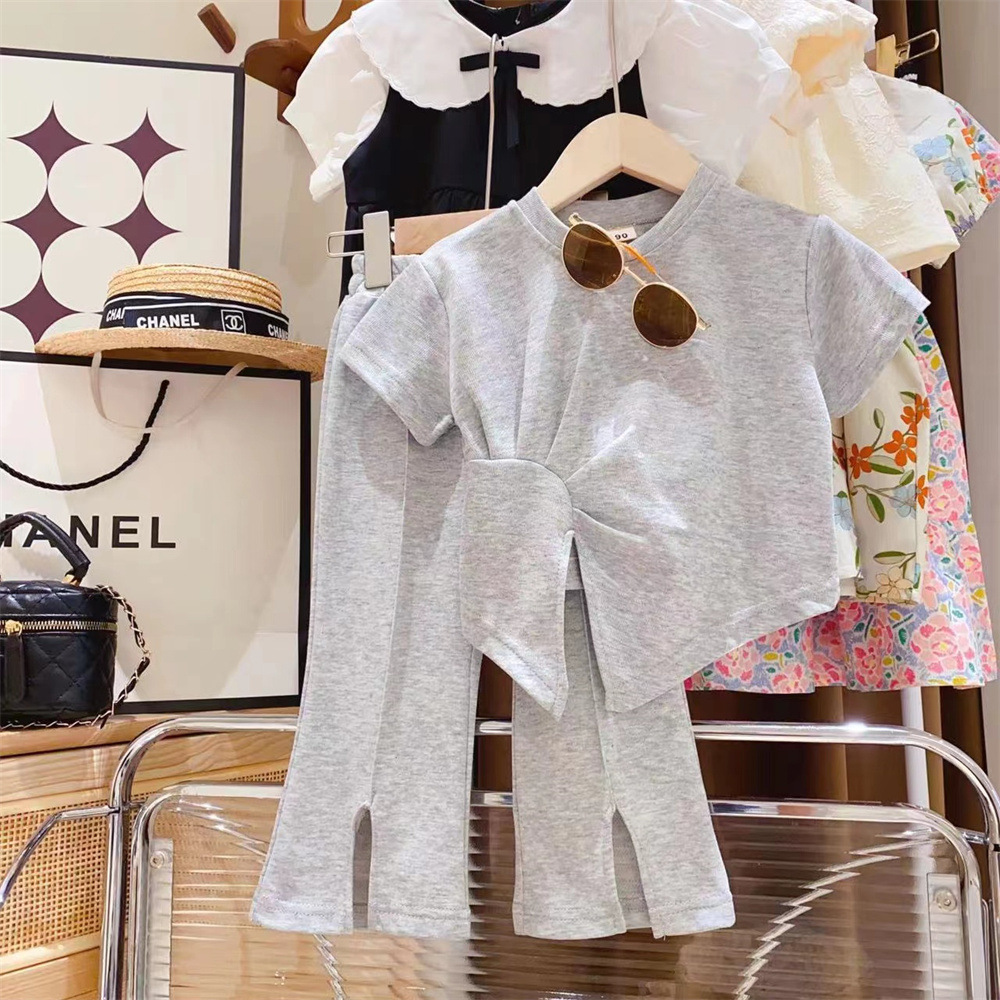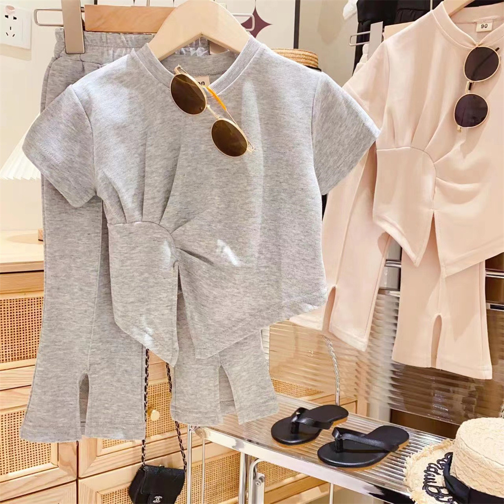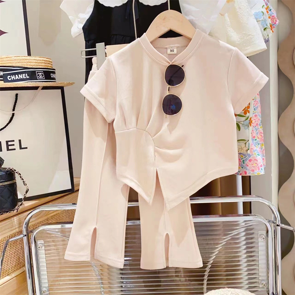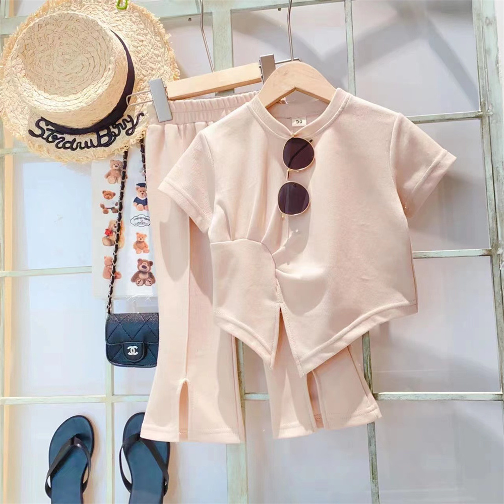 新品女童套装设计感不规则开衩打底T恤喇叭裤中小两件套2025夏装