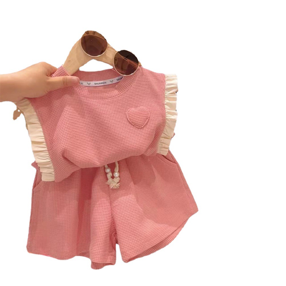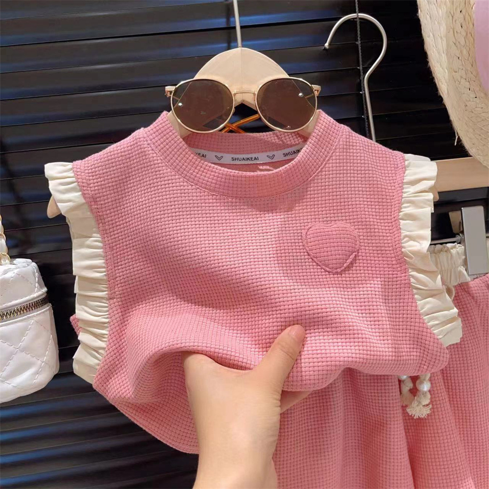 新品女童木耳花边华夫格爱心背心短裤洋气两件套2025夏装小童套装