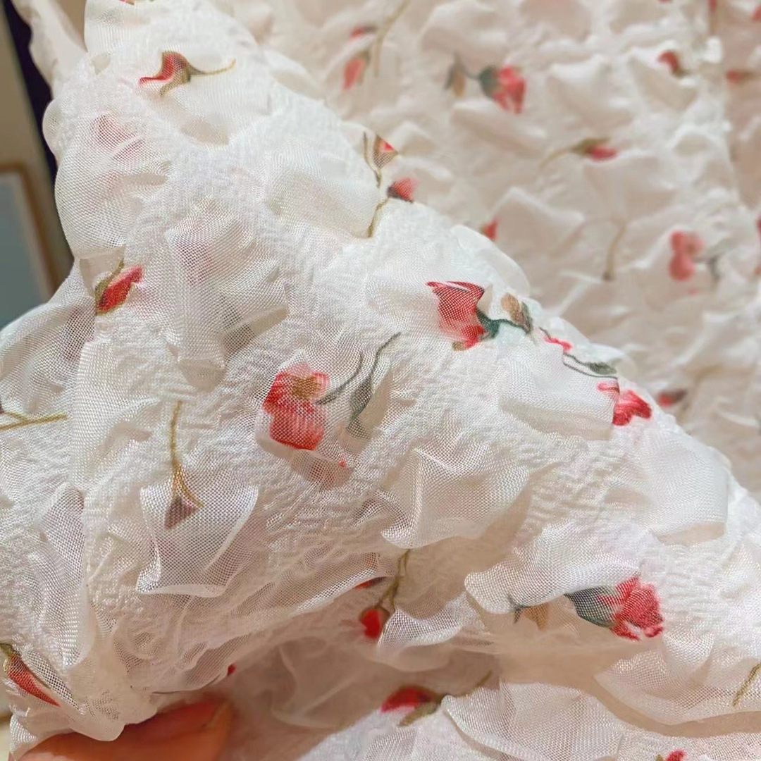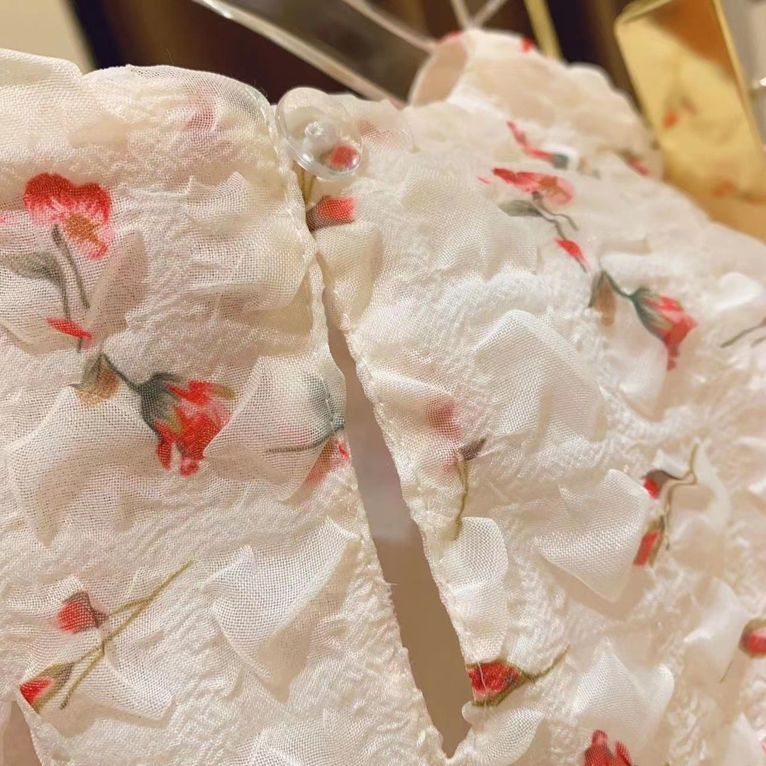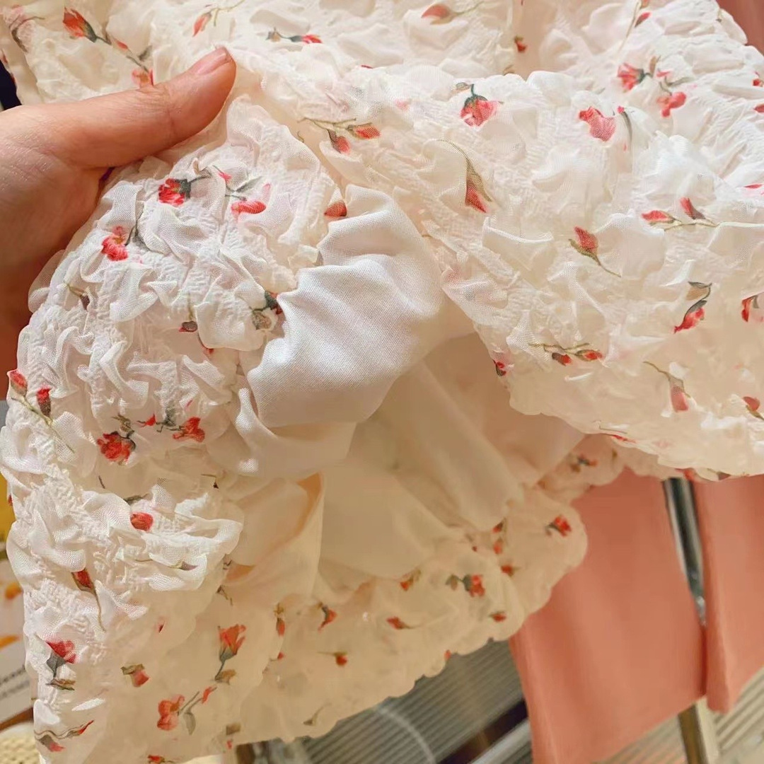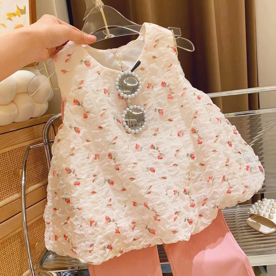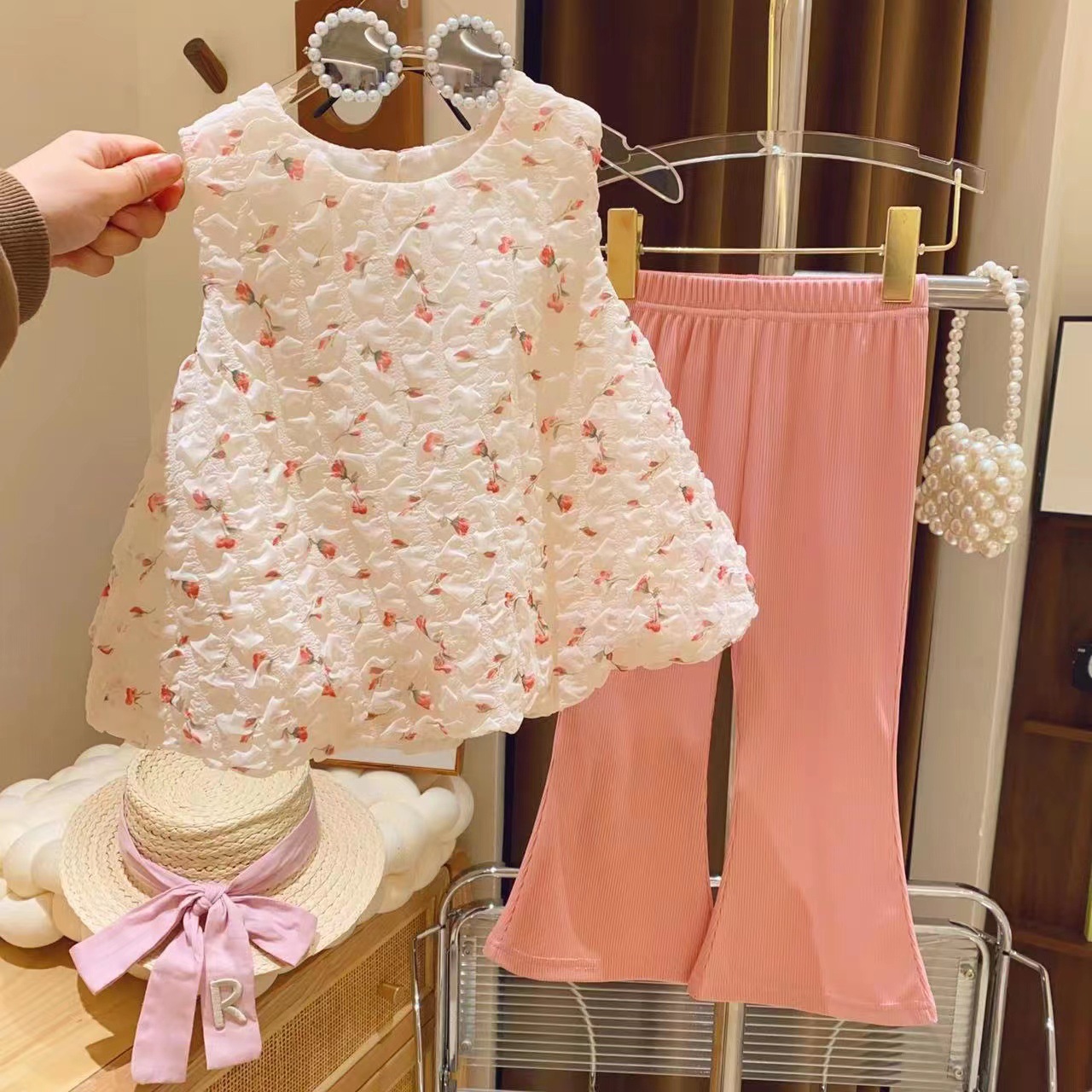 新品女童压褶花苞碎花打底背心坑条喇叭裤两件套2025夏装