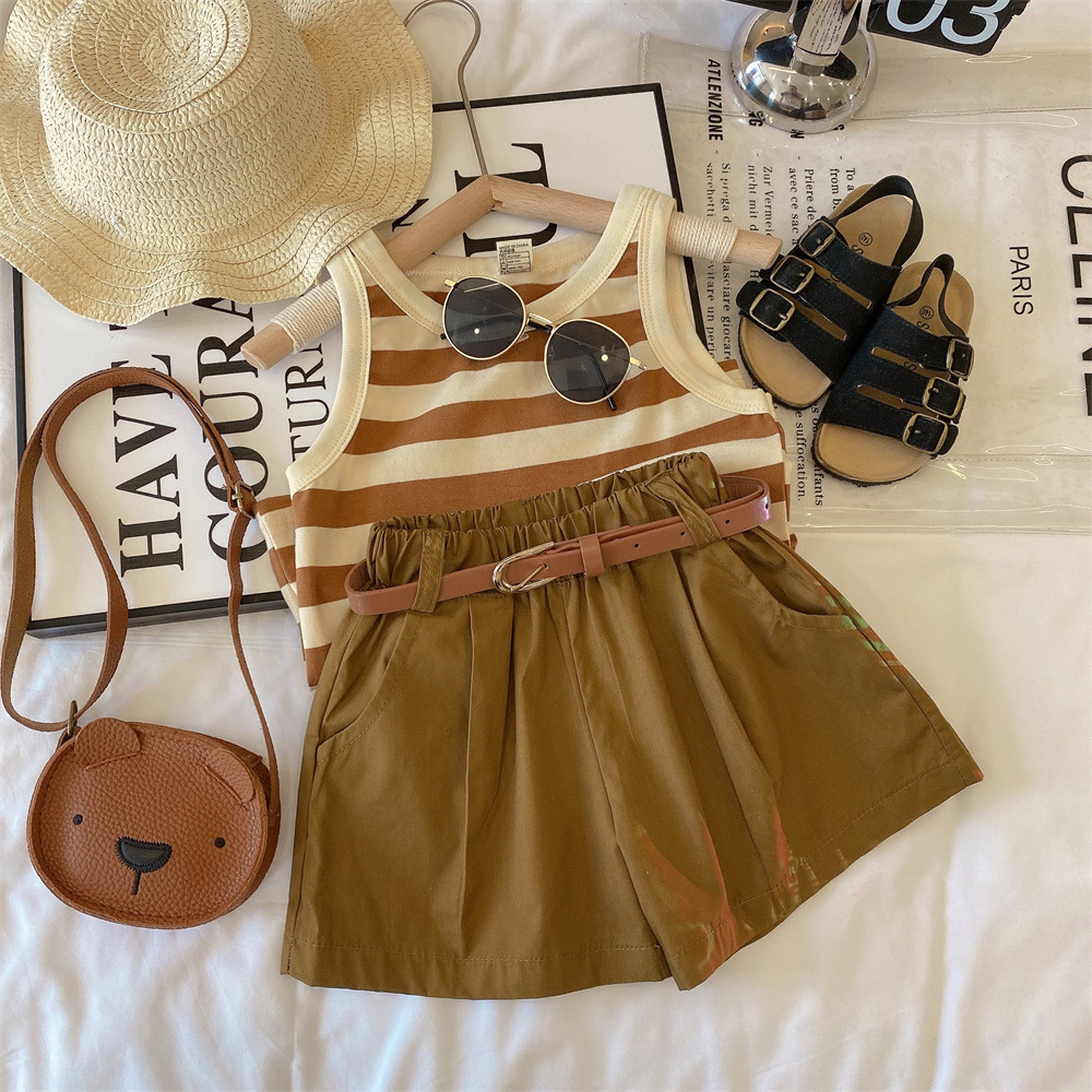 新品逛街神器女童条纹包边背心休闲短裤两件套2025夏装套装