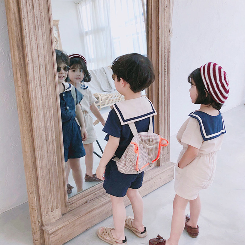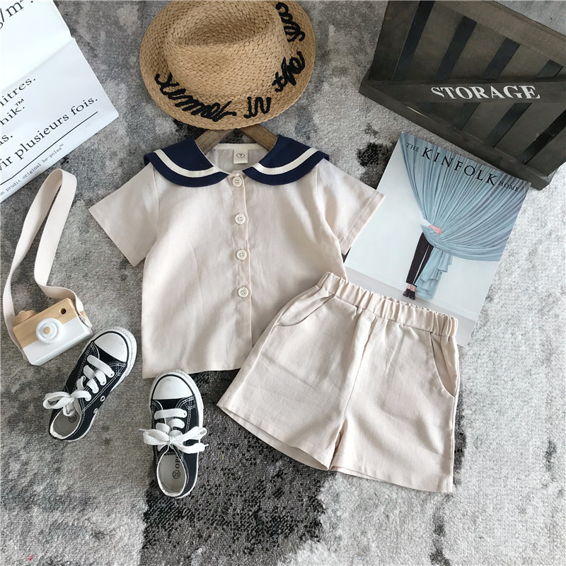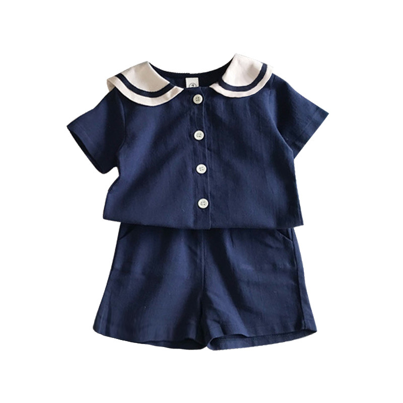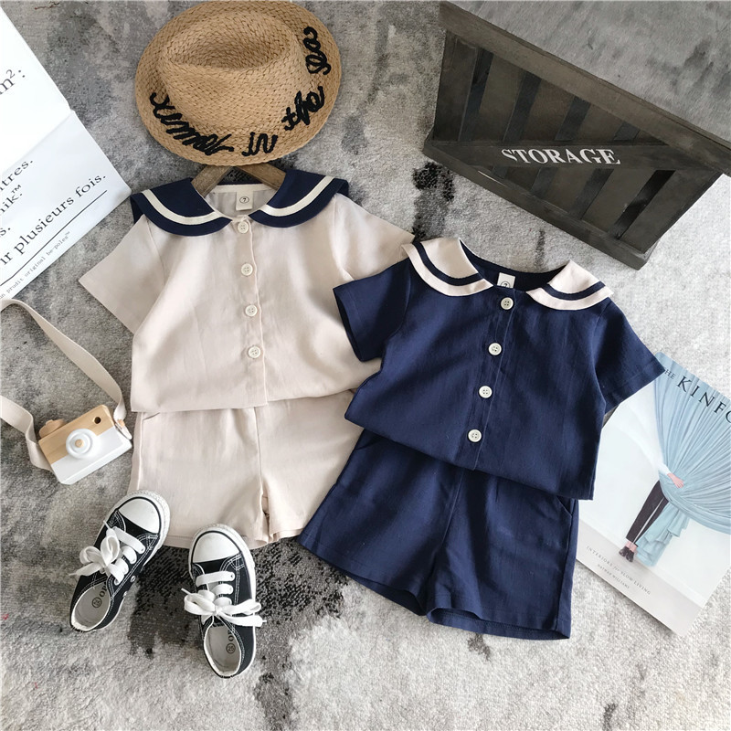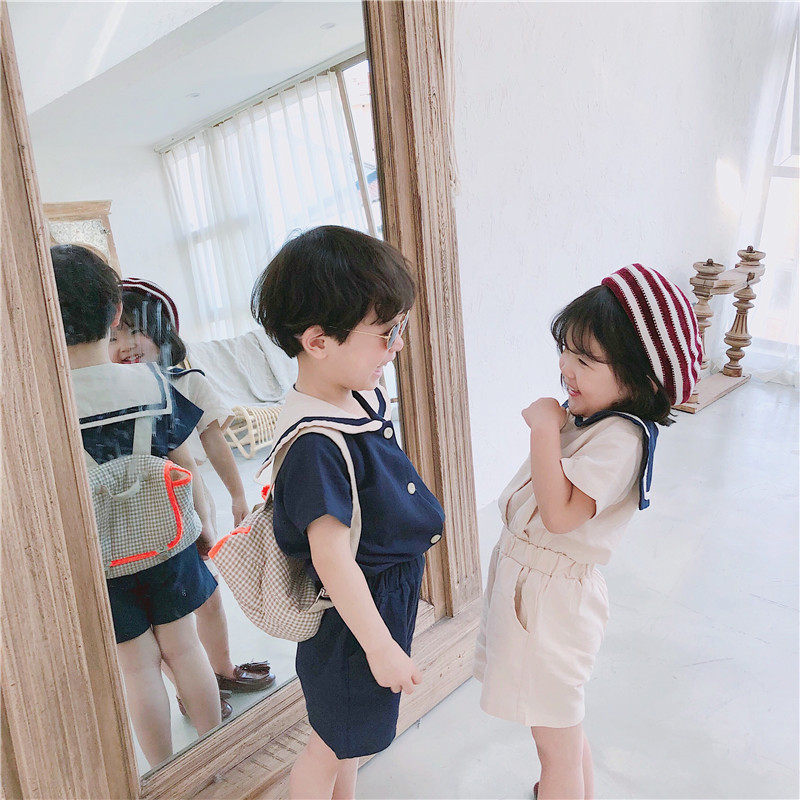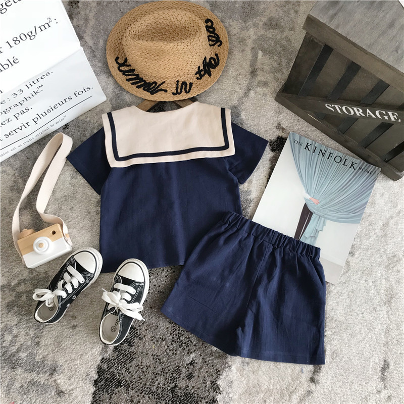 男童炸街童装夏季韩版海军风棉麻短袖宝宝短裤女童两件套兄妹装薄