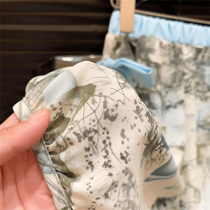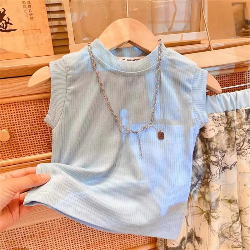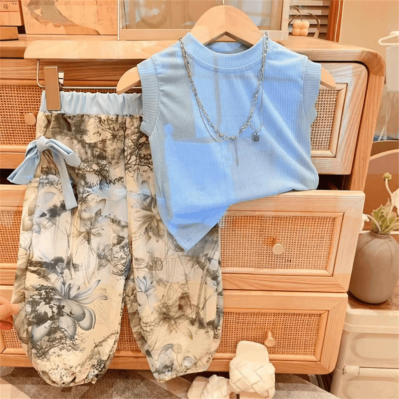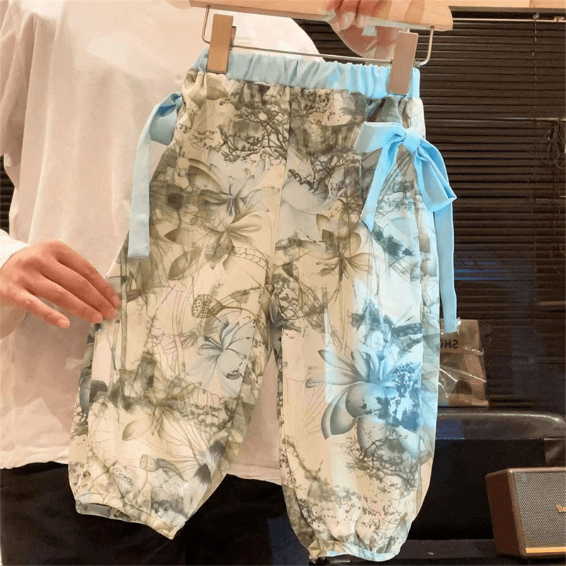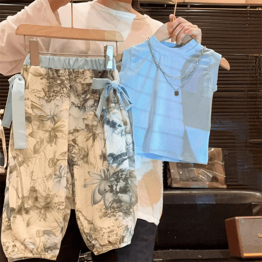 2025夏季新款中国风女童无袖背心水墨画长裤套装宝宝防蚊裤两件套