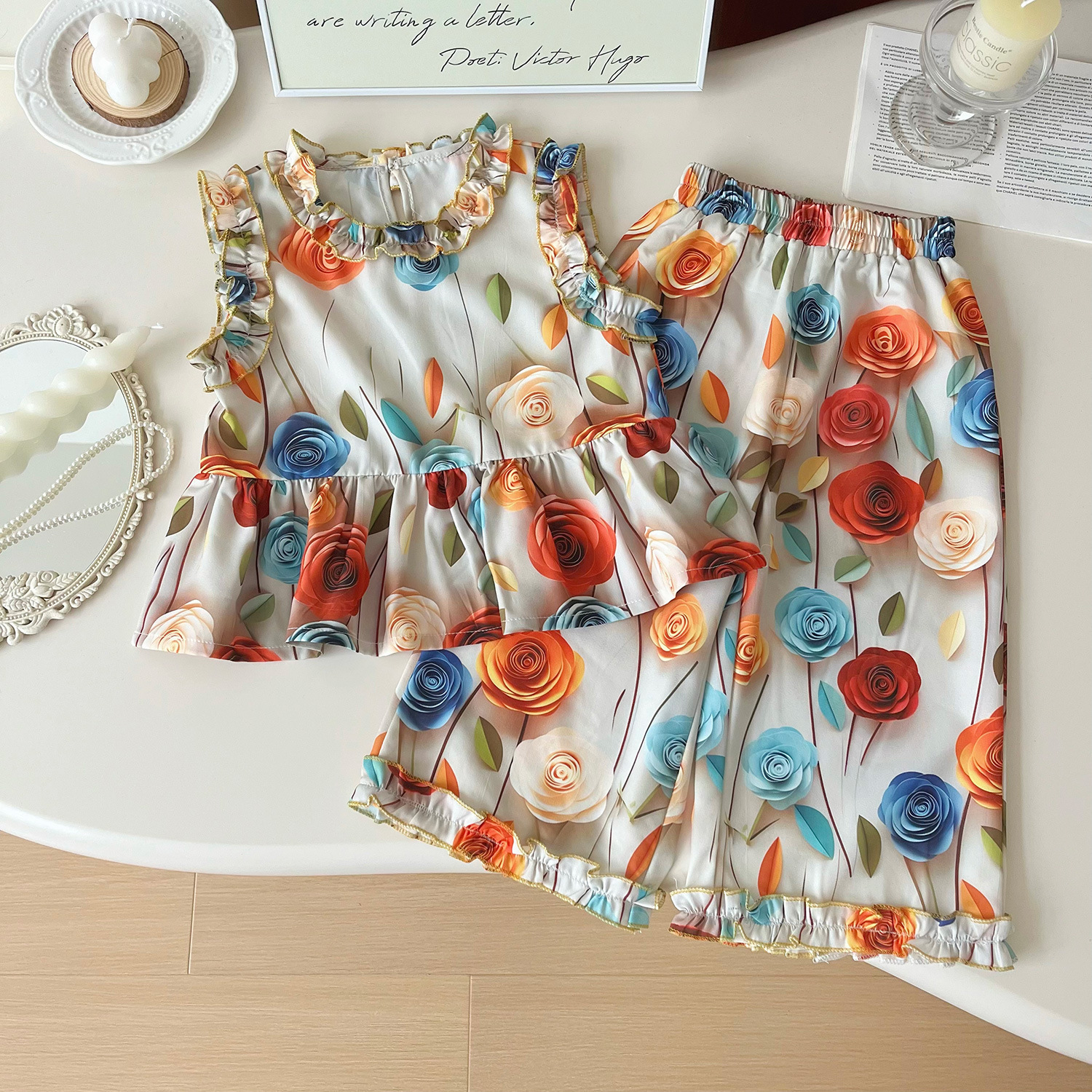2025夏季新款韩版女童花布料女孩复古花色姐妹款三件套