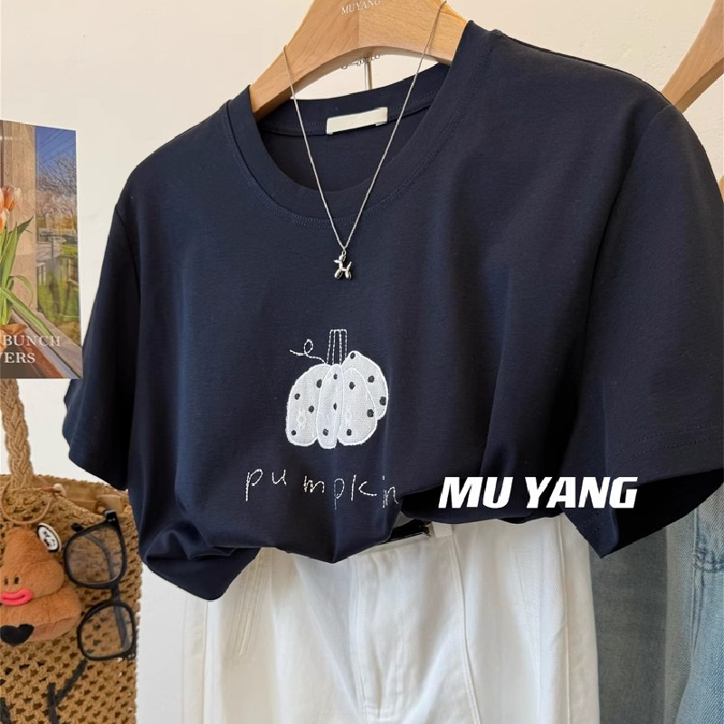 精梳棉大南瓜刺绣圆领短袖T恤女2025夏季新款休闲舒适感洋气上衣