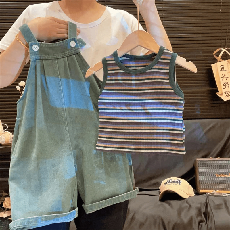 2025夏季新款韩版洋气条纹内衫牛仔背带裤两件套女孩帅气可爱套装
