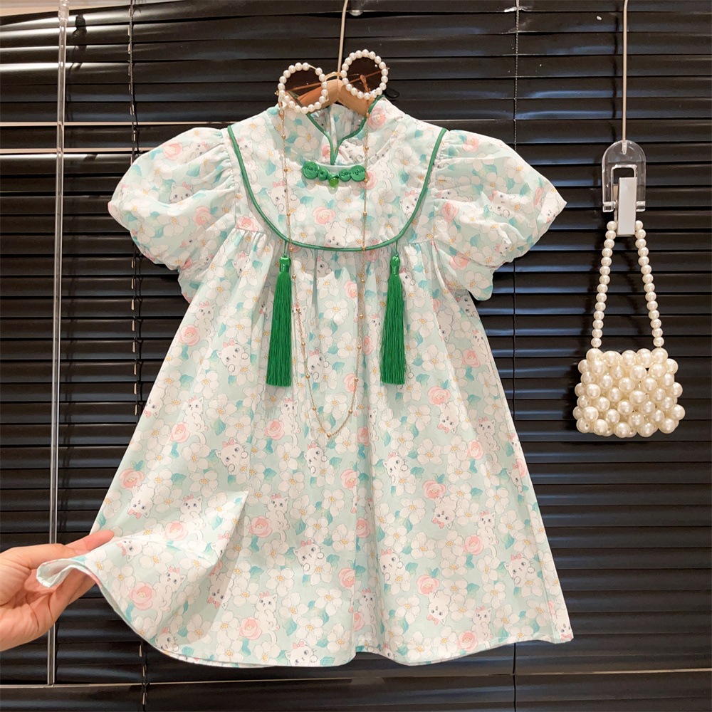 新品女童国风小花泡泡短袖流苏吊坠立领公主裙2025夏装连衣裙