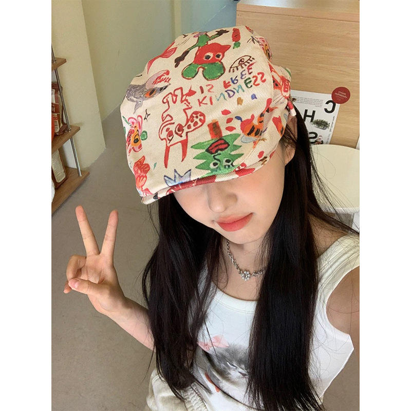 韩系涂鸦彩色前进帽女个性复古童趣贝雷帽搞怪短檐画家帽子百搭潮