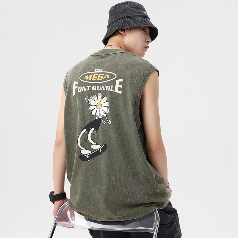 美式复古水洗做旧背心男夏季宽松设计感高街坎肩休闲运动无袖t恤