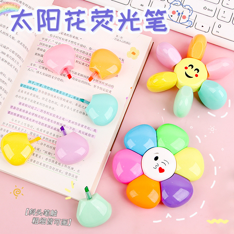 创意太阳花荧光笔高颜值卡通六色花瓣轮廓笔旋转解压手帐笔