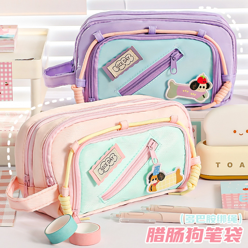 多巴胺撞色腊肠狗大容量笔袋魔术贴高颜值日系ins风新款文具盒