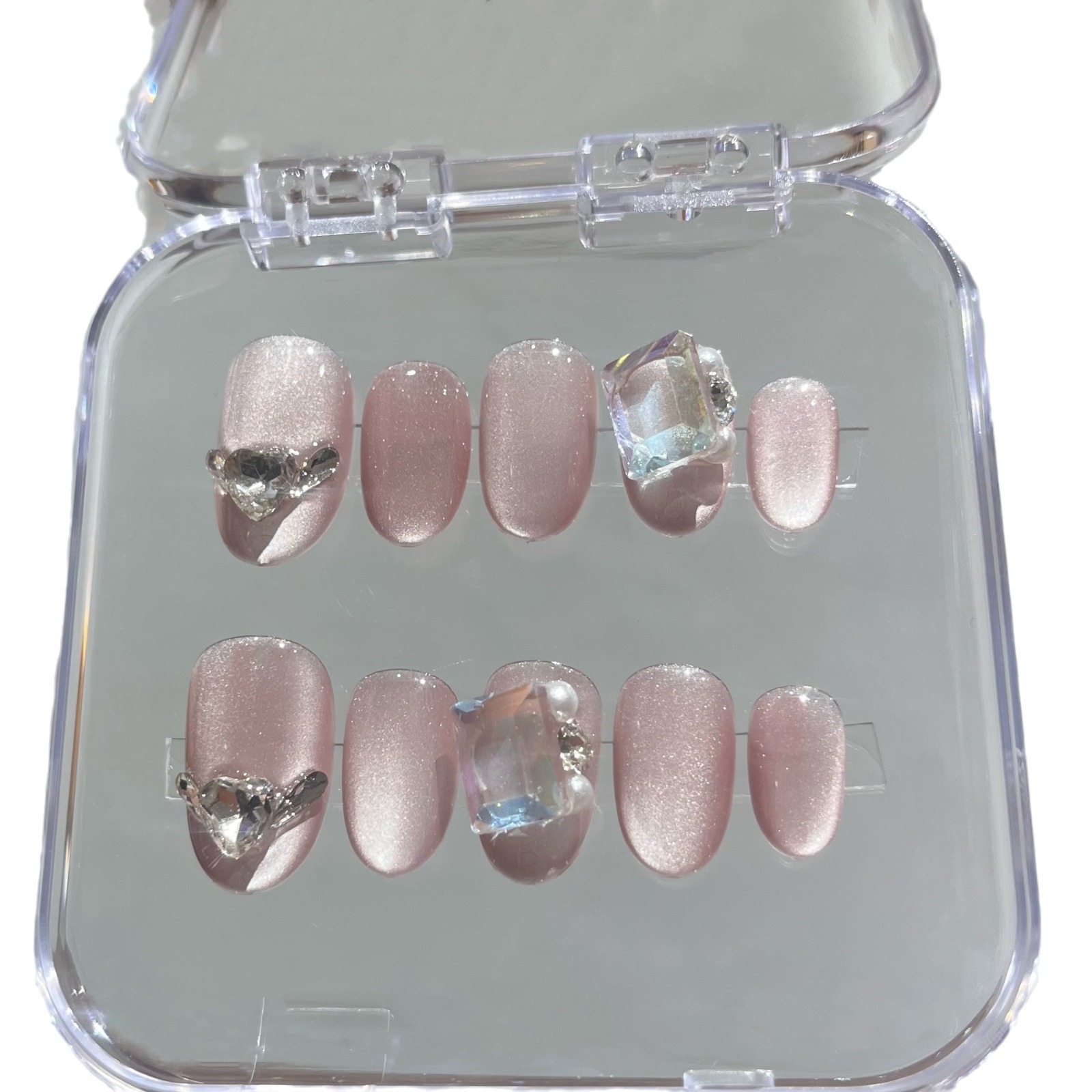 粉黛千金纯手工穿戴甲藕粉猫眼贴钻短款温柔高级感美甲可重复使用