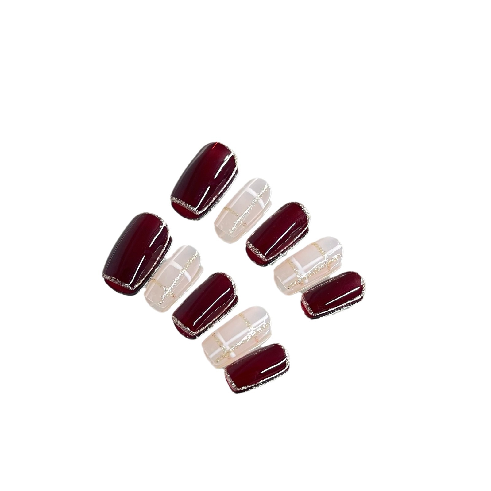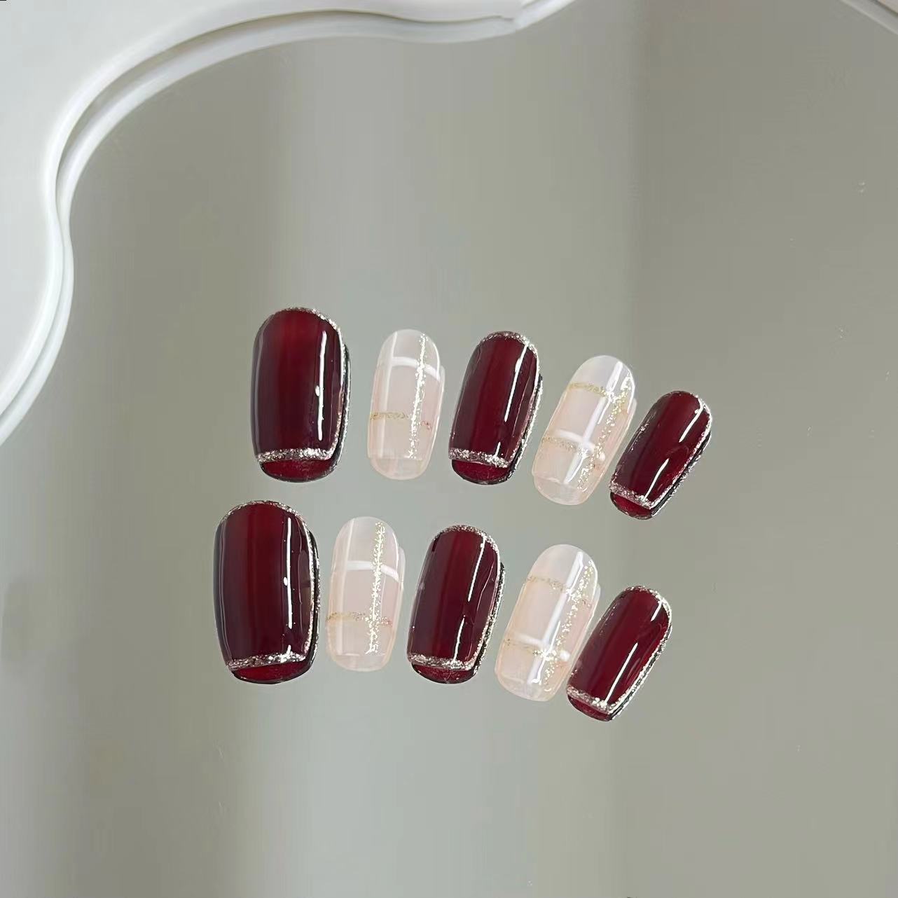 秋冬法式酒红色美甲贴片光疗美甲贴片新年短款穿戴甲成品批发代发