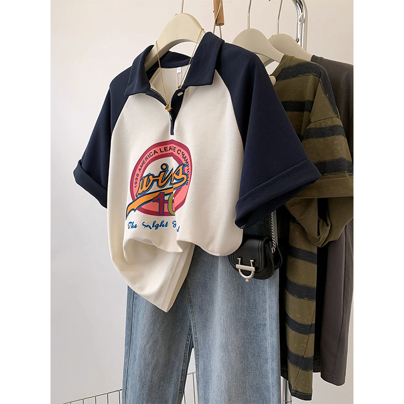 polo领撞色插肩短袖T恤女夏宽松中长款学院风设计感休闲半袖上衣