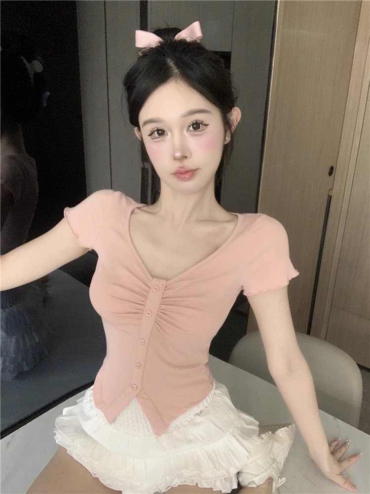 设计感芭蕾运动风短款T恤女夏纯棉2025新款高腰露脐V领上衣打底衫