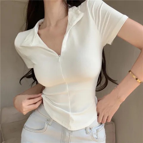 纯棉拉链翻领紧身polo领短款短袖t恤女2025新款纯欲甜辣风上衣夏