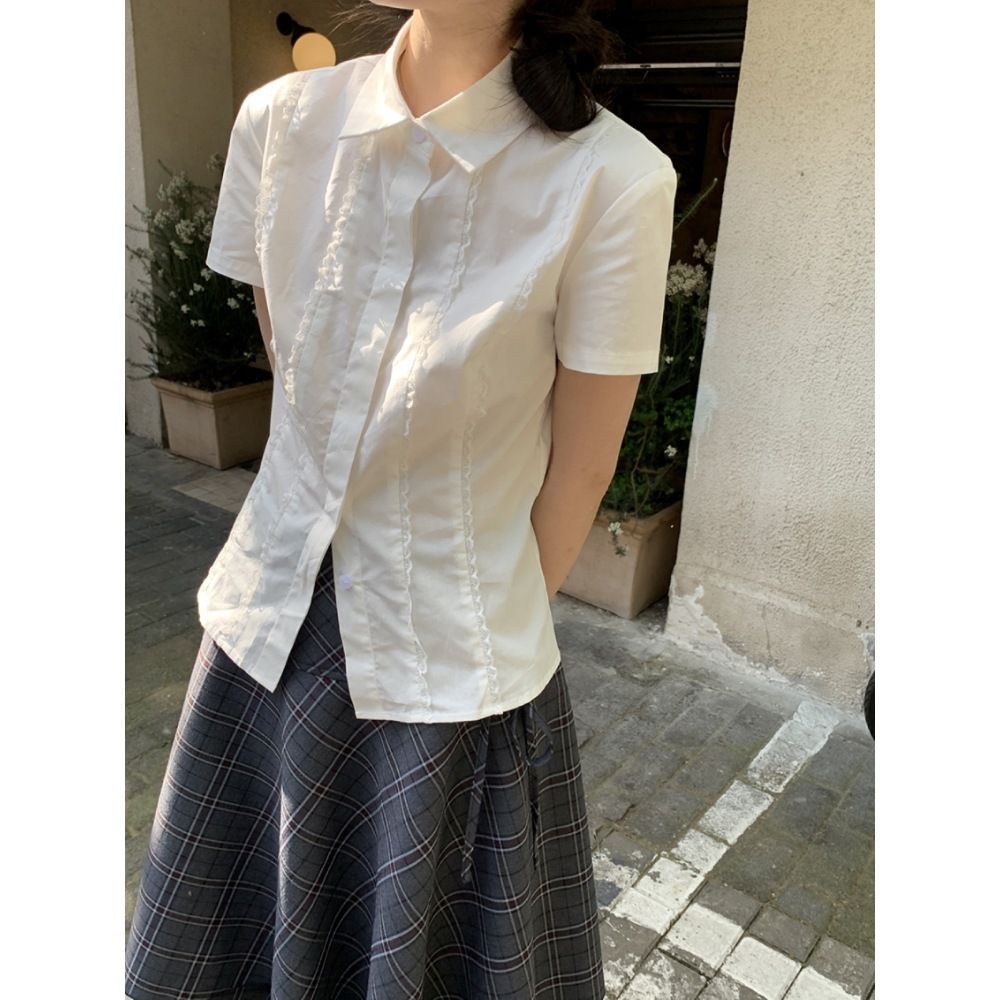 新款白色短袖衬衫女夏季学院风上衣设计感蕾丝花边修身衬衣女