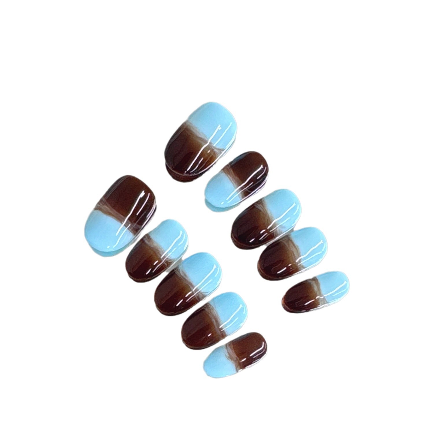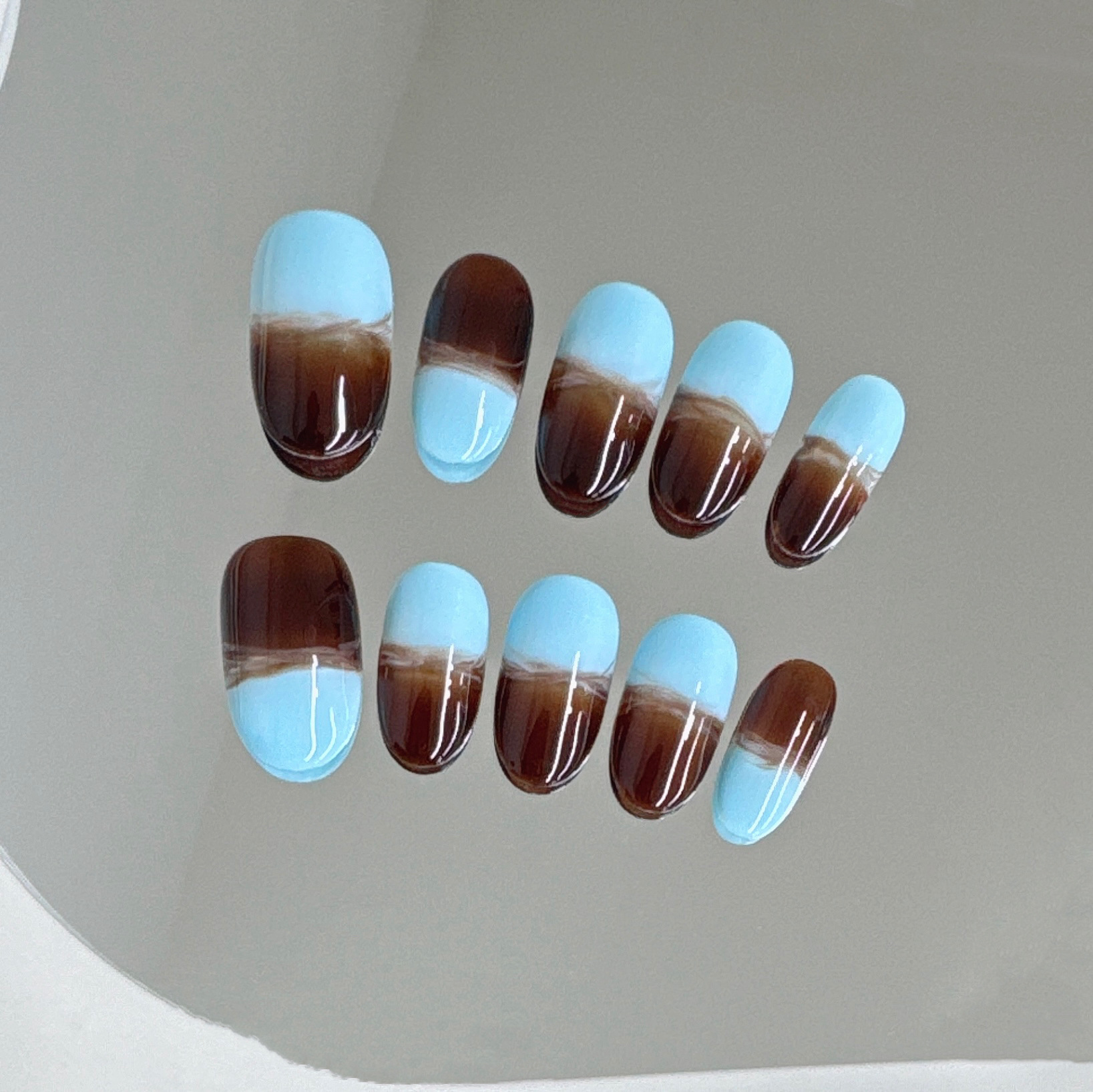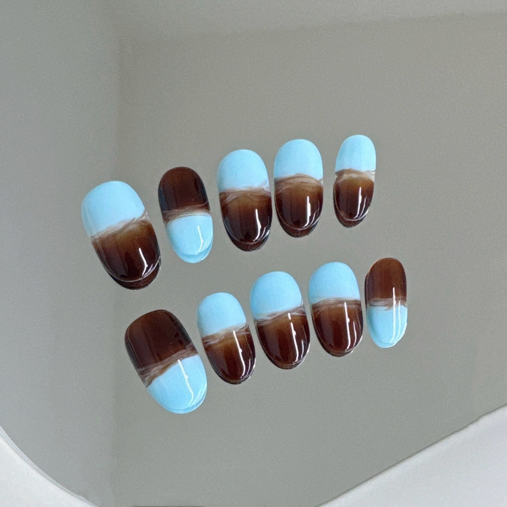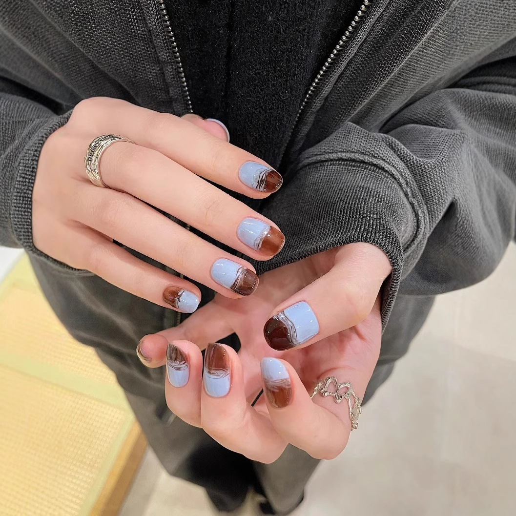 手工穿戴甲不规则色块湖蓝巧棕晕染高级感撞色拼接纯欲风显白美甲